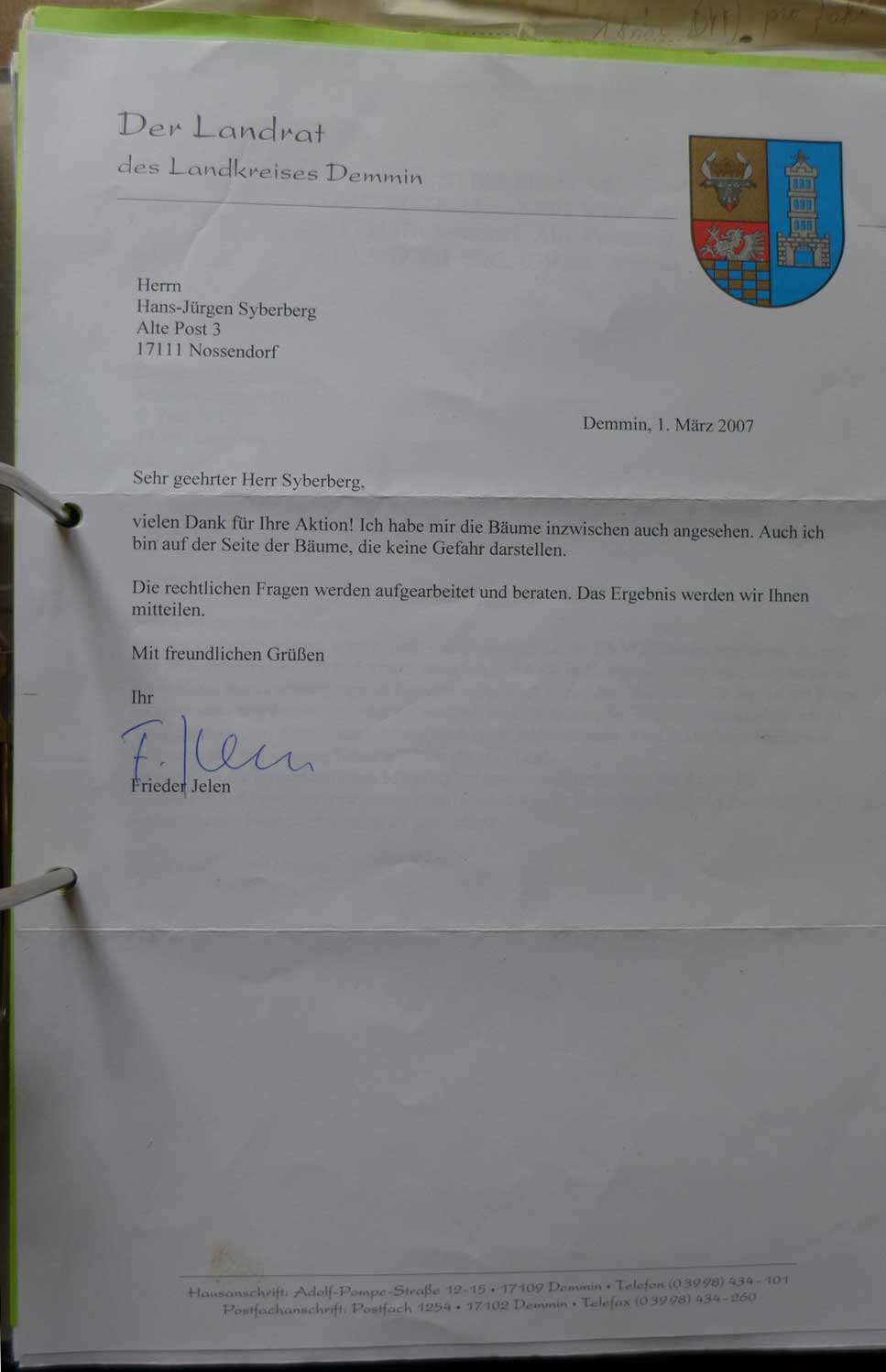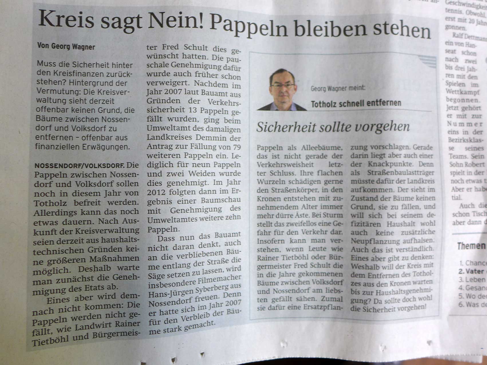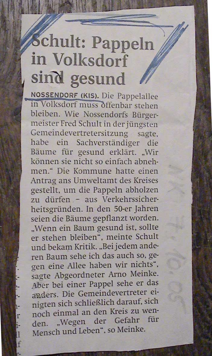 Also aufgepasst liebe Gemeinde-Vertreter, dass nicht wieder gemauschelt wird. Diese Bäume sind nicht krank, vom Ex-Landrat Jelen seinerzeit selbst zur Begutachtung in Auftrag gegeben. Wer sie antastet, rührt an eure heiligsten Güter: der Rechte an Eurer Umwelt.