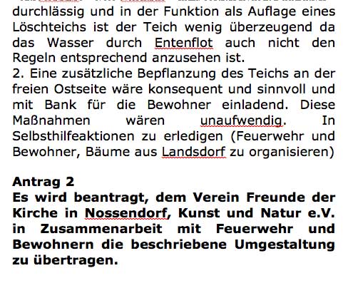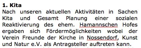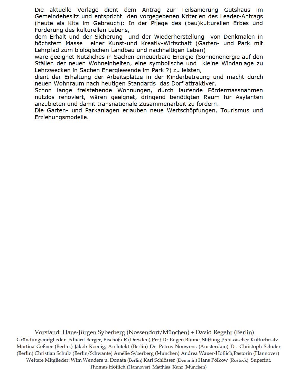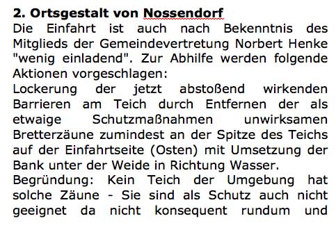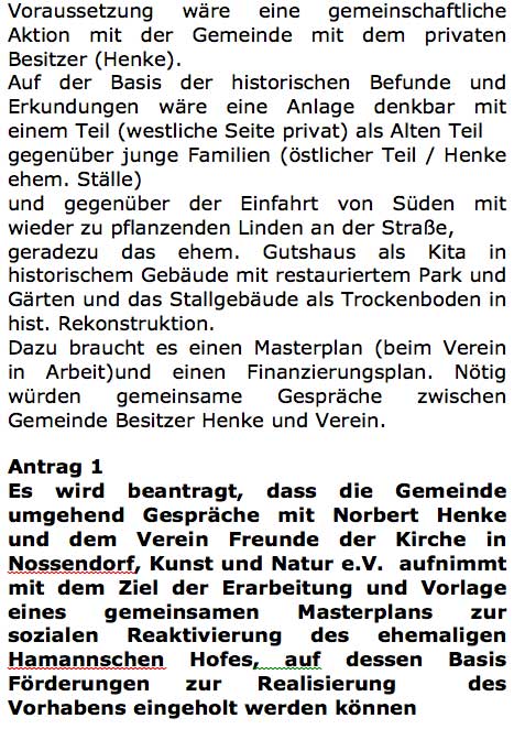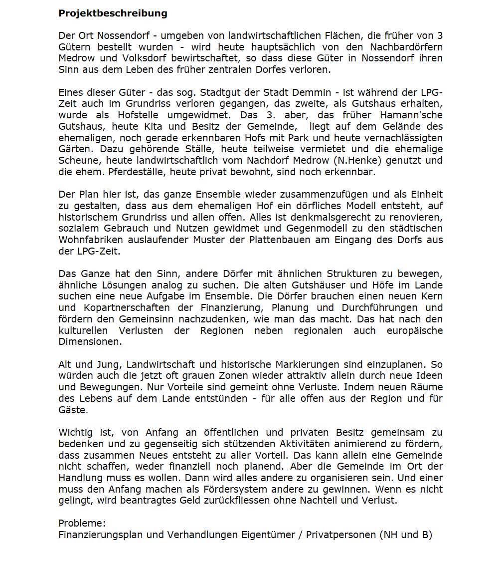 aktuell geht es heute um einen Antrag im LEADER-Programm, den die Freunde Nossendorfs stellen können, wenn die Gemeinde N. es so will. Heute also der Beschluss. Zunächst im Detail also nur um eine Ergänzungsfinanzierung zur Kita, Fassade und Umfeld(Park, Garten und Hof)