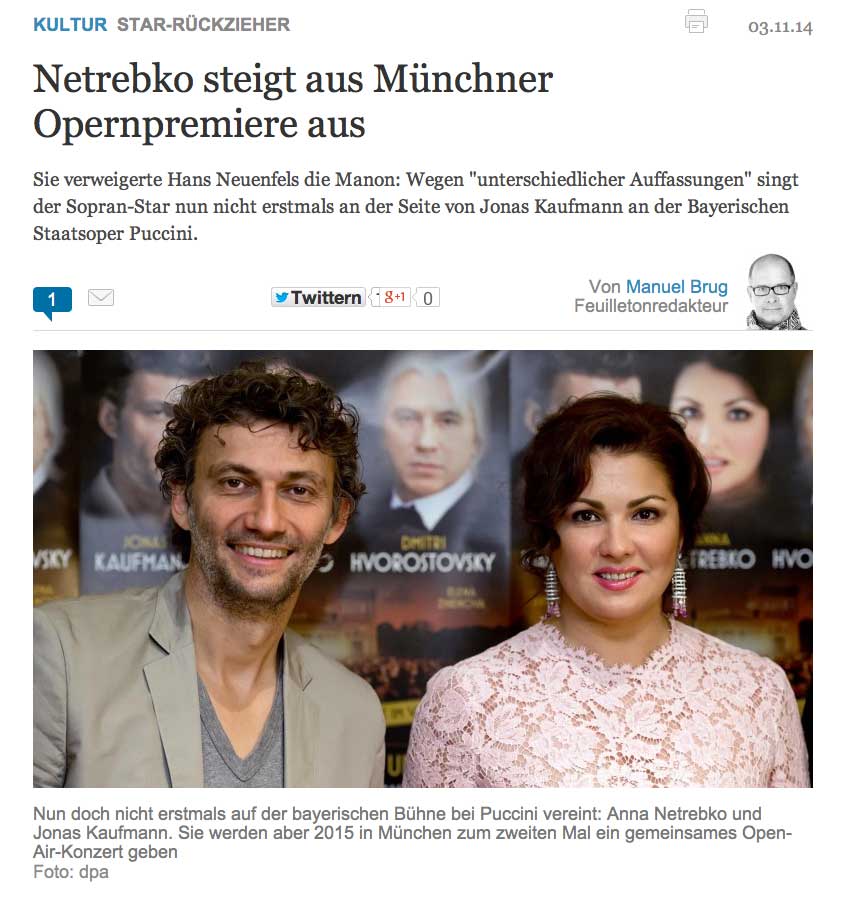 Die Bayerische Staatsoper stehe dafür, "erstklassige musikalische Qualität mit spannenden, mutigen Regieansätzen zu verbinden", kommentierte deren Intendant Nikolaus Bachler den spektakulären Rückzieher. "Dass in Einzelfällen künstlerische Konstellationen nicht funktionieren, kommt in unserem Metier vor." Weiter sagte er: "Es ist Anna Netrebko dennoch zu danken, dass sie sich frühzeitig entschieden hat, die Premiere zurückzugeben. Wir freuen uns auf das Wiedersehen mit Kristīne Opolais und auf weitere Engagements von Anna Netrebko in den kommenden Spielzeiten." Gegenüber Superstars ist man eben nicht nachtragend.