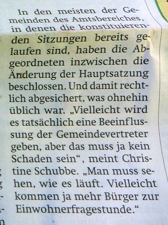 Wir, die Freunde für Nossendorf, hatten schriftlich gebeten ein Antragsrecht zu Sitzungen der Gemeindevertretung in die Hauptsatzung aufzunehmen. Schon darüber zu reden, wurde also verwehrt. Wir hatten dringlich gebeten in die Hauptsatzung eine Beschränkung der Bürgermeistervollmachten mit nachträglichem Abnicken zu setzen, damit nicht wieder irreparabeles Unheil geschieht wie bisher. Auch nur zum Reden darüber wurde nicht aufgefordert. Wir hatten vorgeschlagen, jene Themen von Umwelt, Kultur und Natur aus der Kommunalverfassung auch in die Hauptsatzung verpflichtend zu schreiben. Es ist das, worauf die dann gewählten Stellvertreter eines nicht gefundenen Bürgermeisters der Zukunft schworen. Und was in der Vergangeheit schmählich versäumt und missachtet wurde. Stattdessen wurde die alte Haupsatzung als "kann so bleiben" beschlossen.d.h. ein Nossendorf wie es nun aussieht, das selbst sein bisheriger Bürgermeister-Stellverteter Henke als "wenig einladend" charakterisierte. Und wo es nur besser wurde, immer ohne Bürgermeister oder gegen ihn wie er in wichtigen Dingen ohne Gemeindevertreter zu befragen handelte. Zuletzt durch Aussperrungen der Bürger bei Terminen aus öffentlichen Gebäuden und Bruch der Beschlüsse seiner GV und neuen Fällanträge ganzer Alleen.
