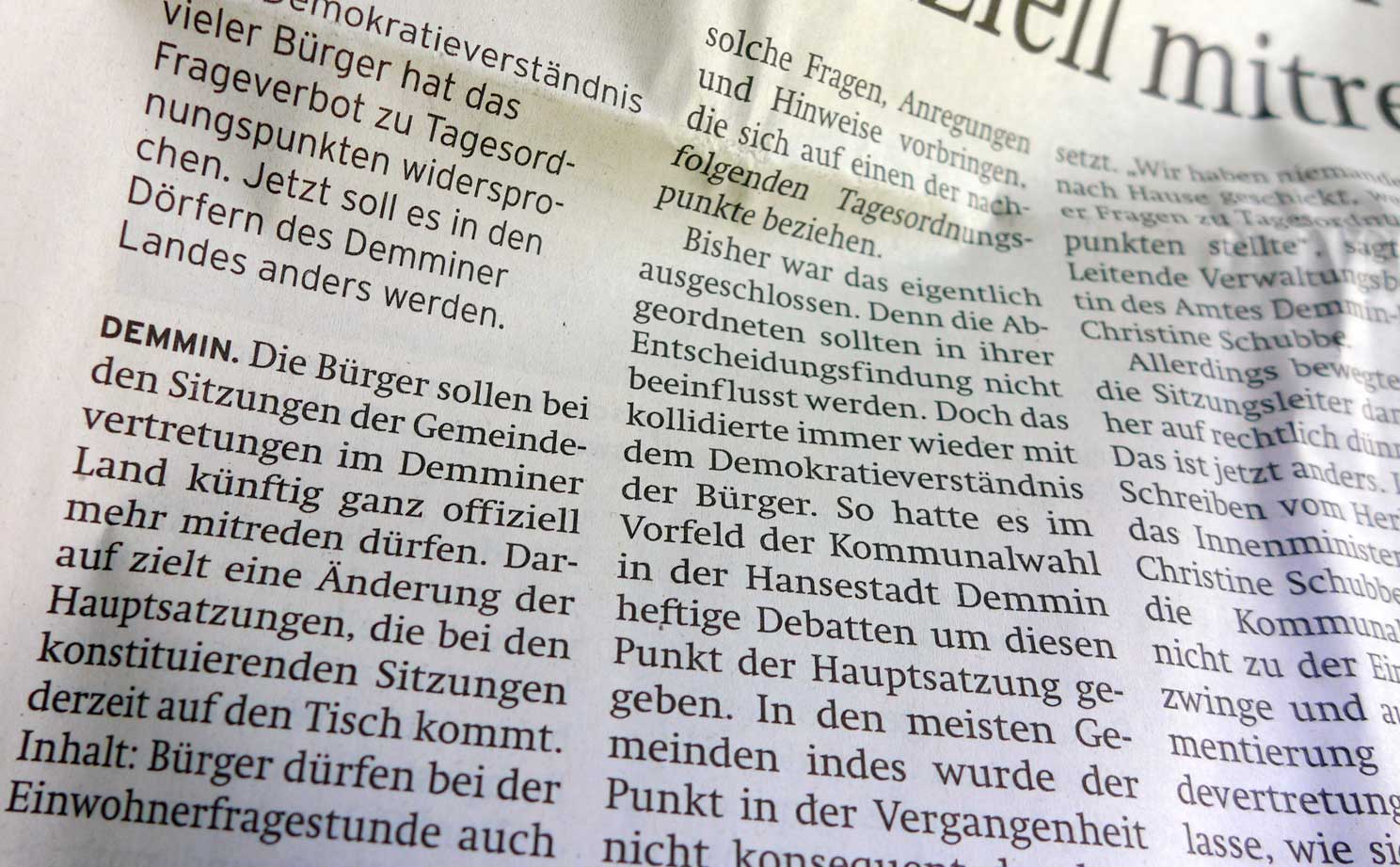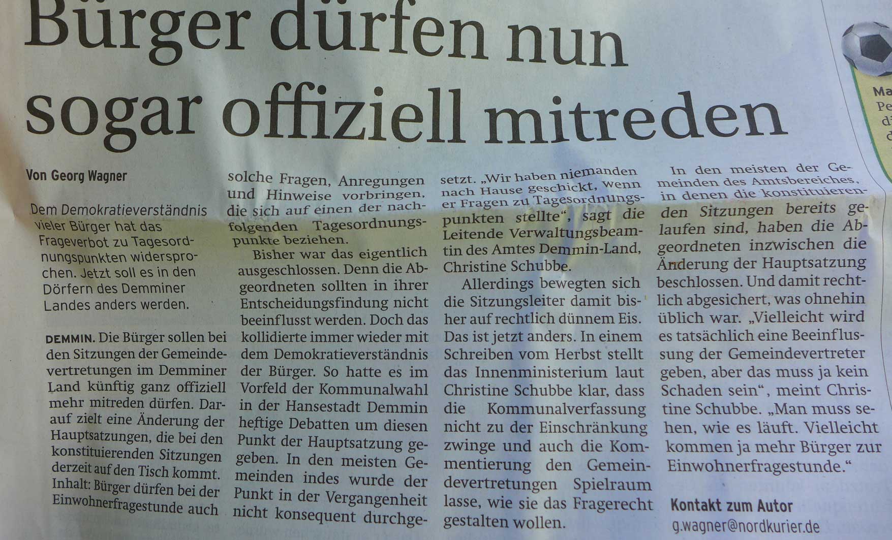 "Die Gemeinden als wesentliche Grundlage des demokratischen Staates"(KV) brauchen wir hier nicht steht schon in der Kommunalverfassung, wie Amtsleiterin in Demmin Land sagt. Der Schwur darauf zum Antritt der Bürgermeisterstellvertreter eine Farce.