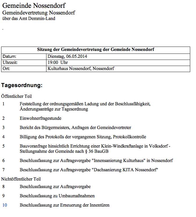 an der Gemeindesitzung um 19 Uhr im Nossendorfer Gemeinde-Haus teilzunehmen und Interesse zu bekunden