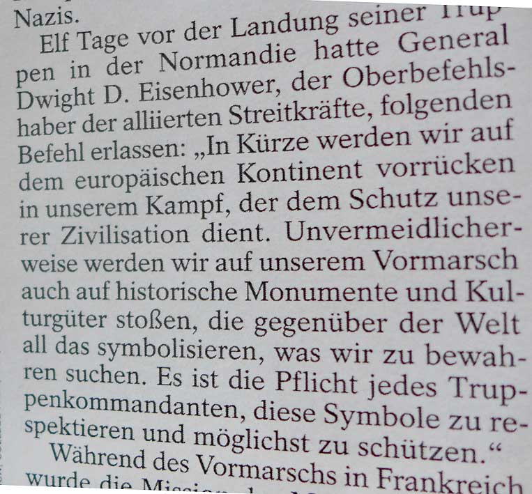 Die Schutzmassnahmen der deutschen Kunst-Historiker im Auftrag der Wehrmacht wurden in Italien besonders deutlich, weil in den Kämpfen vor allen von alliierten Seite viel verloren ging. Dokumente zeigen das. Aufgehoben zu tausenden im Zentralinstitut für Kunstgeschichte in München(Panzerschrank von Heidenreich, dort nach dem Krieg der Direktor und Leiter der Rettungsaktionen in Italien) . Die Bomben in deutschen Städten bis zum Ende des Krieges zerstörten gezielt.