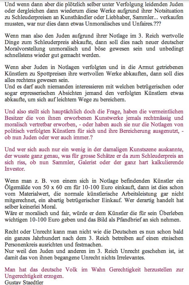 Die Gestzesänderung veranlasst durch den bayerischen Justitzminister nach träglich die Verjährung von "Raubkunst" aufzuheben . Wer stellt die heute Schuldigen vor ihr Gericht - noch vor dem, dem sie nie entkommen, einmal später.