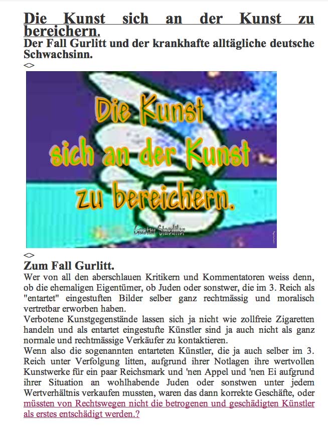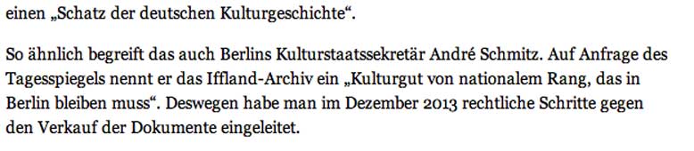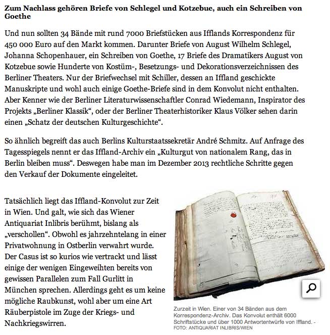im berliner Tagesspiegel zum Fall aufgetauchter Iffland-Dokumente von Peter von Becker wird der Nachlass des Kleist-Feindes ohne Mühe als Urheber eines nationalen Kulruerbes (nach Gesetz) erklärt damit er im Lande bleiben oder dahin konfisziert werden soll, da jetzt durch Kriegsfolgen in Wien und hier versteigert werden soll. Im Fall Gurlitt lässt mans ziehen, was auftaucht, nur weg damit.