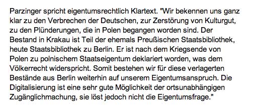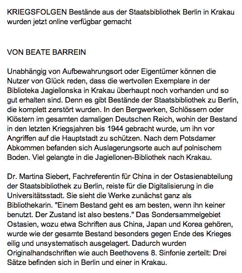 Und wieder wenn sie von einer Digitalisierung der Dokumente aus urspr. Berlin nun in Krakau sprechen, unsere zuständigen Leute vom preuss. Kulturbesitz, dann reden sie von Chinesischen Papieren und Landkarten sich die Köpfe heiss, aber kein Wort zu den eigentlichen Schätzen in Krakau nun: nämlich von Kleists Mansikripten, als ob man froh sei sie endlich loszu werden. Es sind die selben Leute in Berlin, die nun das neu entstehende Schloss mit exotischen Dingen vollstopfen, statt sich um unsere Dinge zu kümmern. Wie sie täglich brennen.