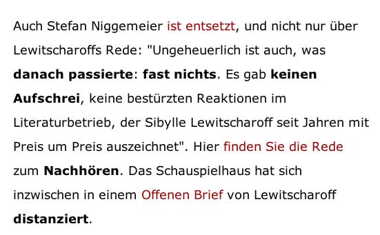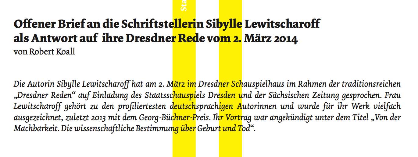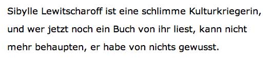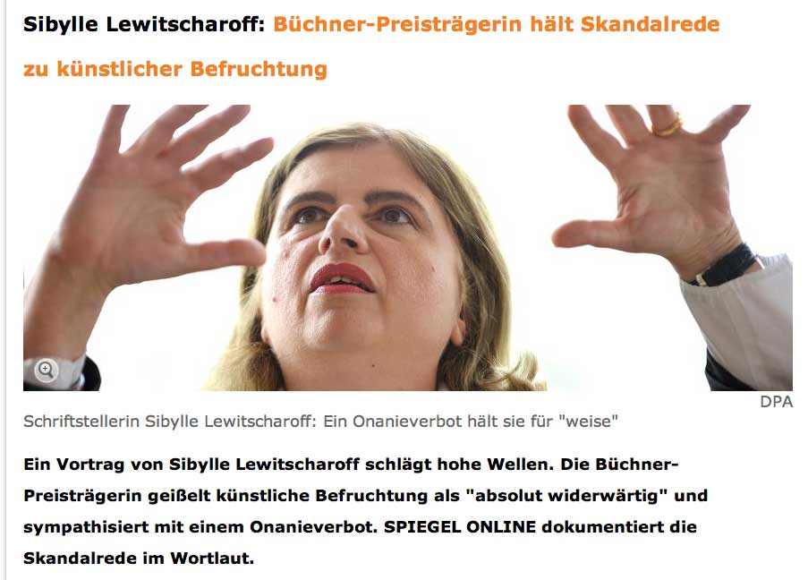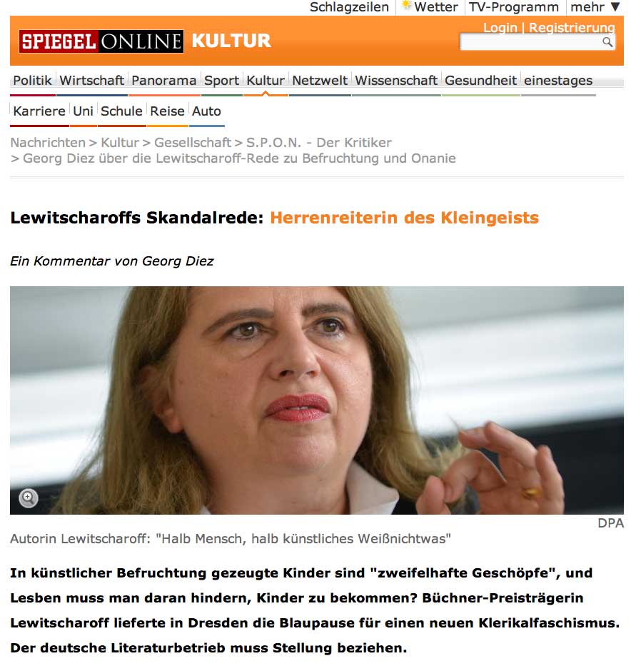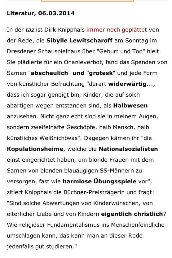 Es ist deprimierend, es ist beschŠmend, und zwar fŸr den gesamten deutschen Literaturbetrieb, der sich so gern mit sich selbst beschŠftigt und sich die Preise zuschanzt. Der Auftritt von Sibylle Lewitscharoff am 2. MŠrz im Staatsschauspiel in Dresden ist eine ZŠsur.Was die BŸchner-PreistrŠgerin an diesem Tag sagte, war so menschenverachtend, herrisch, gefŸhlskalt, reaktionŠr und ressentimentgeladen, dass all die Literaturkritikerinnen und -kritiker und all die Betriebsonkel und -tanten, die sie gefšrdert haben mit Preisen und Stipendien, vom Preis der LiteraturhŠuser Ÿber den Preis der Leipziger Buchmesse bis zum Kleist-, Ricarda-Huch-, Marieluise-Flei§er-, Wilhelm-Raabe- und eben Georg-BŸchner-Preis, und all die Institutionen, in denen sie Mitglied ist, von der Deutschen Akademie fŸr Sprache und Dichtung Ÿber die Berliner Akademie der KŸnste bis zur Villa Massimo in Rom, sich dazu verhalten mŸssen. Wie stehen sie zu einer Schriftstellerin, die bestimmte Menschen als "Halbwesen" bezeichnet?