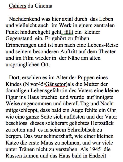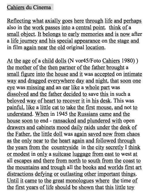 In contacting you today we are inviting you to tell and describe in its most physical sense an emotion that overtook you and the moment in a movie, whether a gesture, dramatic situation, or sequence of images, that sparked this emotion. We envision your answers as a way of sharing with our readers a secret, intimate experience, not necessarily your first movie memory, but rather a sudden realization that has echoed throughout your life, an image from which you have never recovered – the moment that was, to paraphrase Kafka, "the axe to break the frozen sea within you."