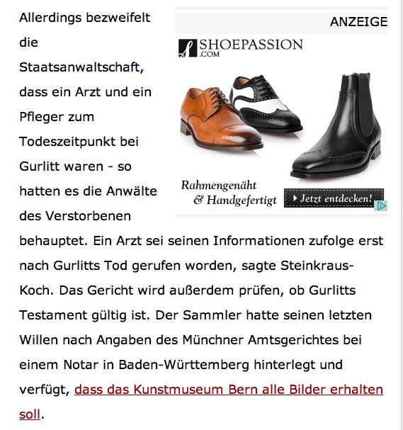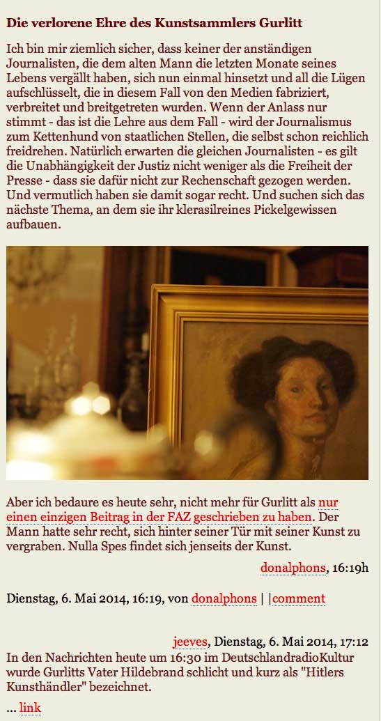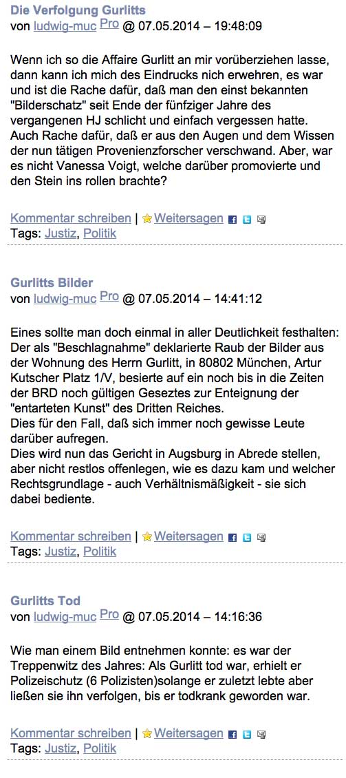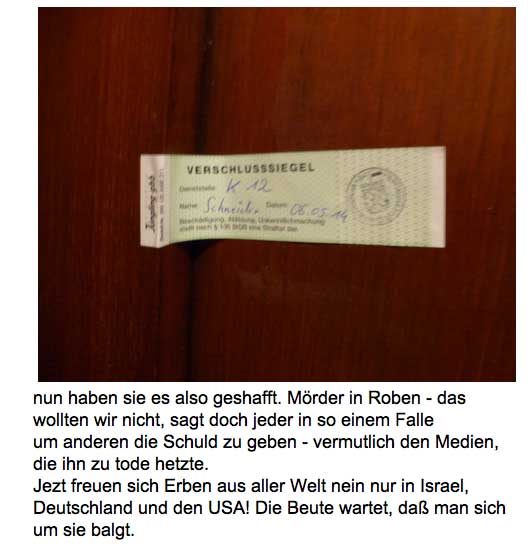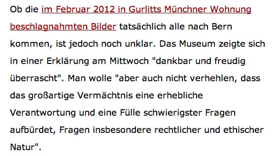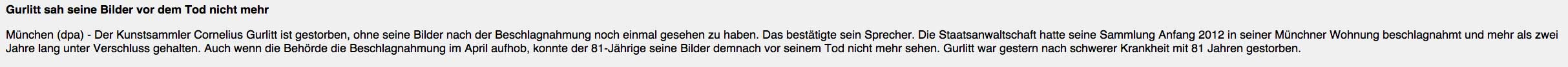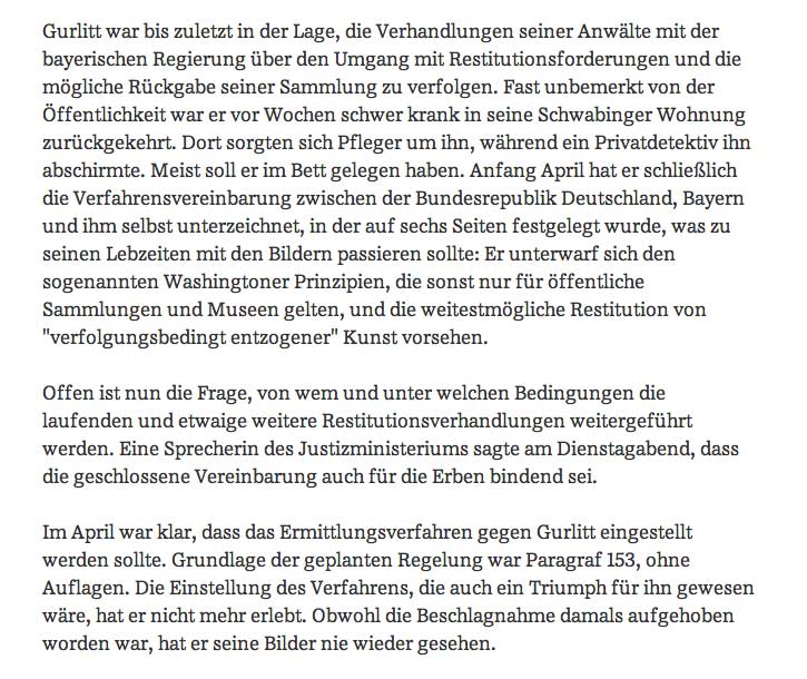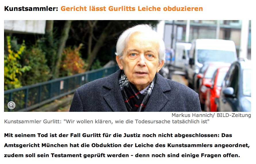 Wer verlangt eine Untersuchung des soganannten Provenienz - Auftragsan die Regierung. War er noch verhandlungsfähig, -willig, gab es eine authentisch geprüfte Unterschrift, einen Notar, schon die Fragen tauchen nicht auf. Es gibt keinen Frager mehr, oder deren Berichterstattung. Sein einzig authentisches und öffentlich nachprüfbar geäussertes Wort dazu ist : "gebe nichts her". Dies ist nicht nur ein Fall des Rechts und des Staates, sondern auch der Medienpleite.