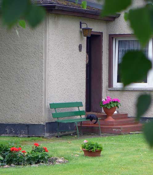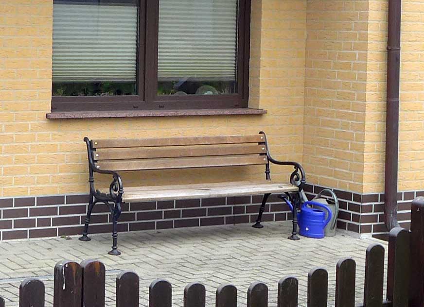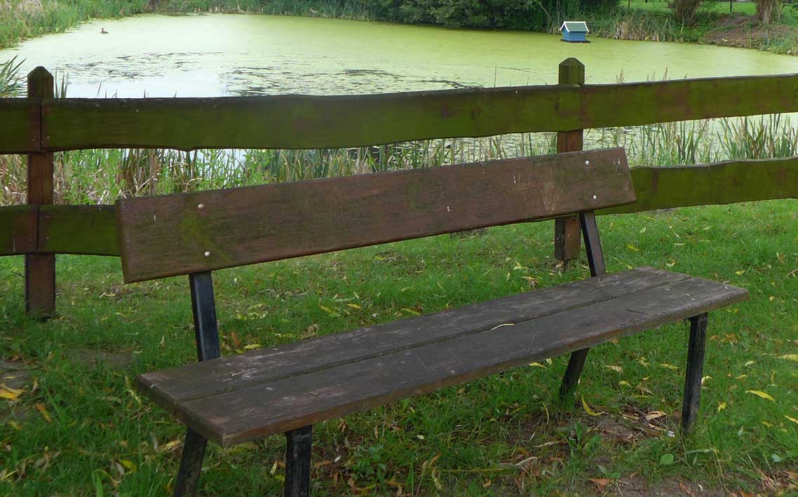 Bänke vor den Häusern des Teichs werden belebt