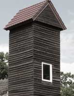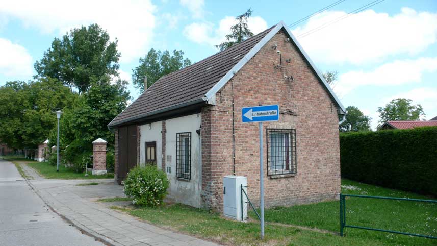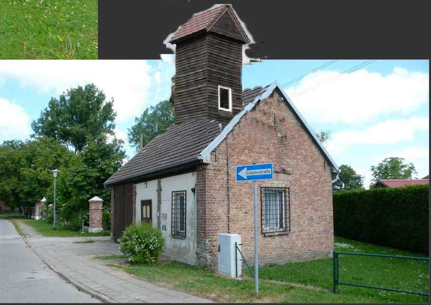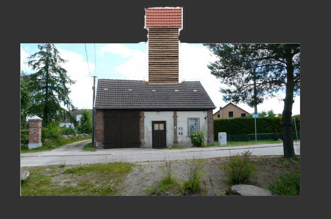 in Richtung Strasse schaut auf das ehem. Spritzenhaus der Feuerwehr, dessen Trockenturm für die Schläuche, abgebrochen und von hier noch vor dem Turm der Kirche zur Wiedererrichtung gespendet und abgewehrt wurde.