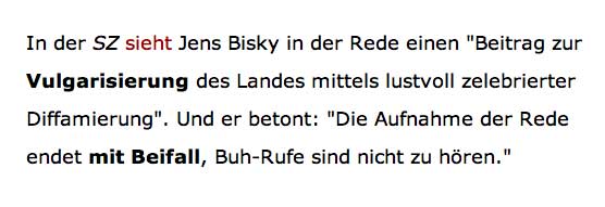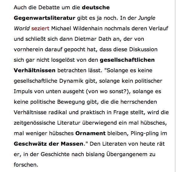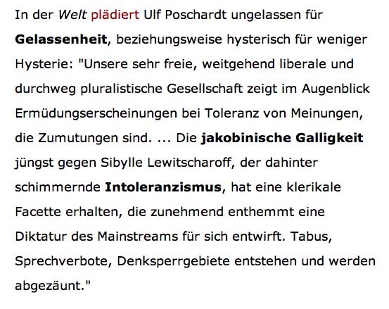 Georg Diez fabuliert in seiner exemplarisch hochmoralischen Kolumne (Link: http://www.spiegel.de/kultur/gesellschaft/lewitscharoff-kolumne-zur-skandal-rede-der-buechner-preistraegerin-a-957342.html) von einer "gefährlichen Diskursverschiebung" in Richtung Antimoderne und Antiaufklärung, die linke Wochenzeitung "Der Freitag" stellt alle jene Denker und Publizisten unter Dunkeldeutschverdacht, die den Schmalspursozialismus eines Teils der Meinungseliten nicht teilen. Überall herrschen rhetorische Standgerichte, Instantverurteilungen, sprachliche Brutalität ohne ironisches Flackern.