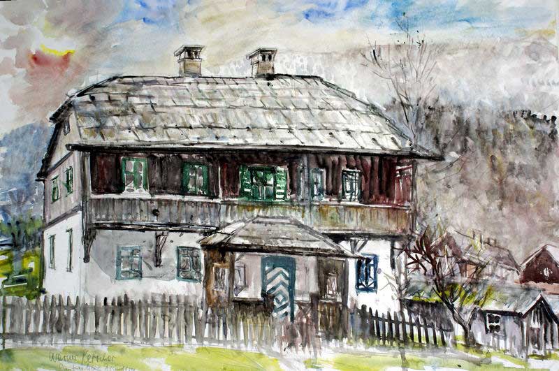 Das Mautner-Haus in der Steiermark/Grundlsee in dortigem Stil. Vor dem Eingang der Vorbau unter Dach aus Holz, zum sitzen, im Winter zu schliessen mit Brettern. Brückerl genannt, Die Brücke von Innen nach Draussen. Oder von Aussen nach Innen.