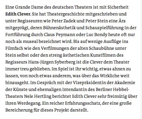 damit die gekürzte Fassung dieses Gesprächs von Edith Clever live wie in der DVD der Akademie der Künste in Berlin