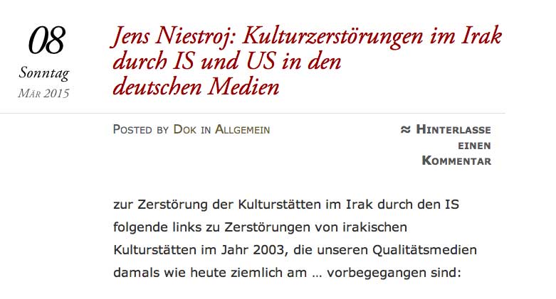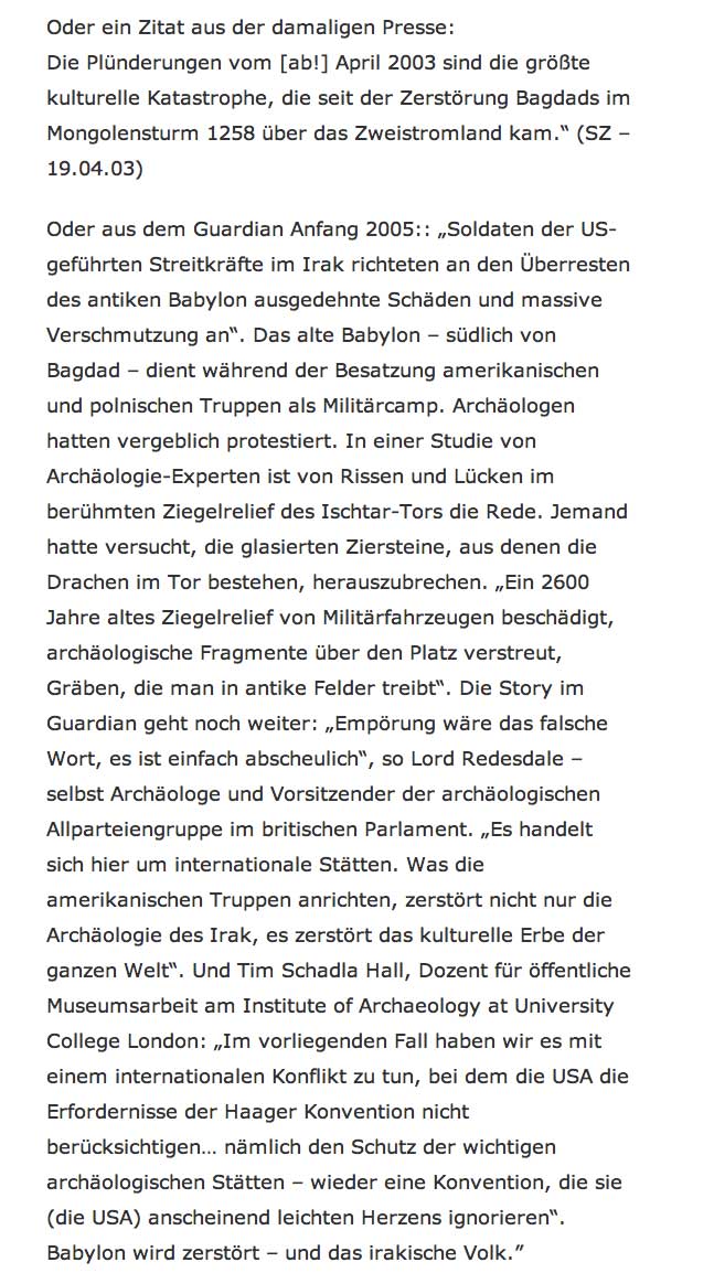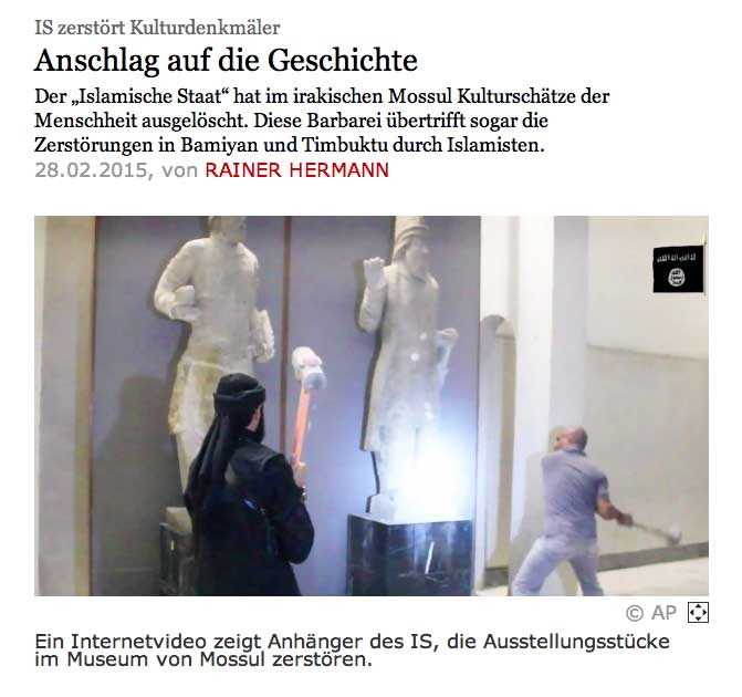 Der finale Untergang des Bösen wie die Bibel den Bibel-Völkern erzählen wollte, wäre dann eigentliches Ziel des Feldzuges in den Ländern Mesopotaniens -heute Irak und Afganistan Syrien ...-auch in ihren letzten Spuren im Sinn? und die jetzigen Büttel der IS nur finsterste Helfer?. An Waffen und Fähigkeiten hochtrainiert und gerüstet, wäre sonst der Schutz dieser alten Kulturen oberstes Gesetz unserees Erbes und für den Gutwilligen kein Problem.Allen anderen Intressen heute Israels -und bei uns!- zum Trotz.