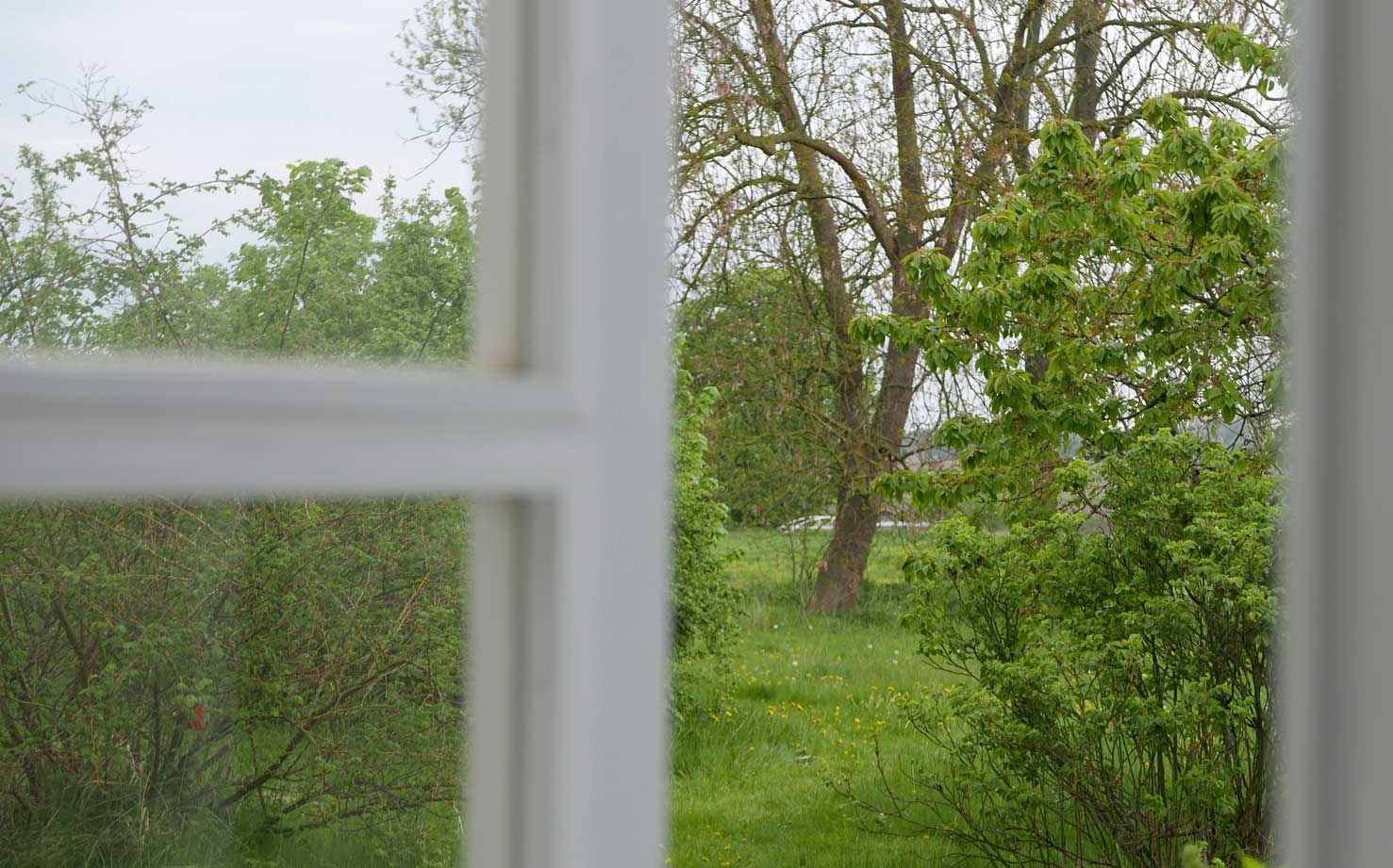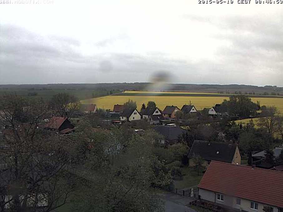 und schauen auf die Felder und den Weg zum Wald mit dem Graben wohin jetzt eine Brücke führt