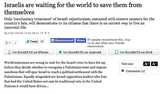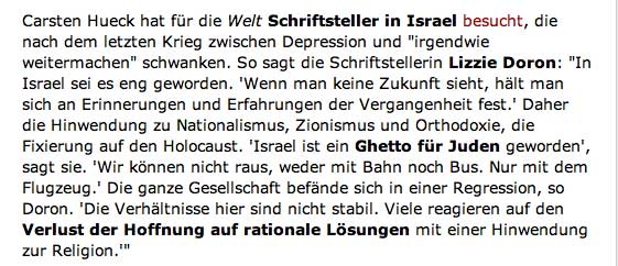 Nur "Zwangsbehandlung" der israelischen Verweigerungshaltung, mit aufrichtiger Sorge um das Schicksal des Landes, kann seinen Bürgern zeigen, dass es keinen richtigen Weg zu Leben gibt, in ein falschen Leben zu führen.