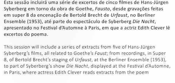 Der Faust von der Schule auf dem Dorfe bis in die Monologe einer Frau und was dazwischen lag. Der alte Kortner noch mal und nur so als Faust, der listige Brecht, nur so erhalten, der letzte Oskar Werner nur als Ton, Schleef nur vor den Türen des sich schliessenden Schiller - Theaters. Jetzt in der Oper von Lissabon, wo der Parsifal seinen Gral gefunden. Als Film.