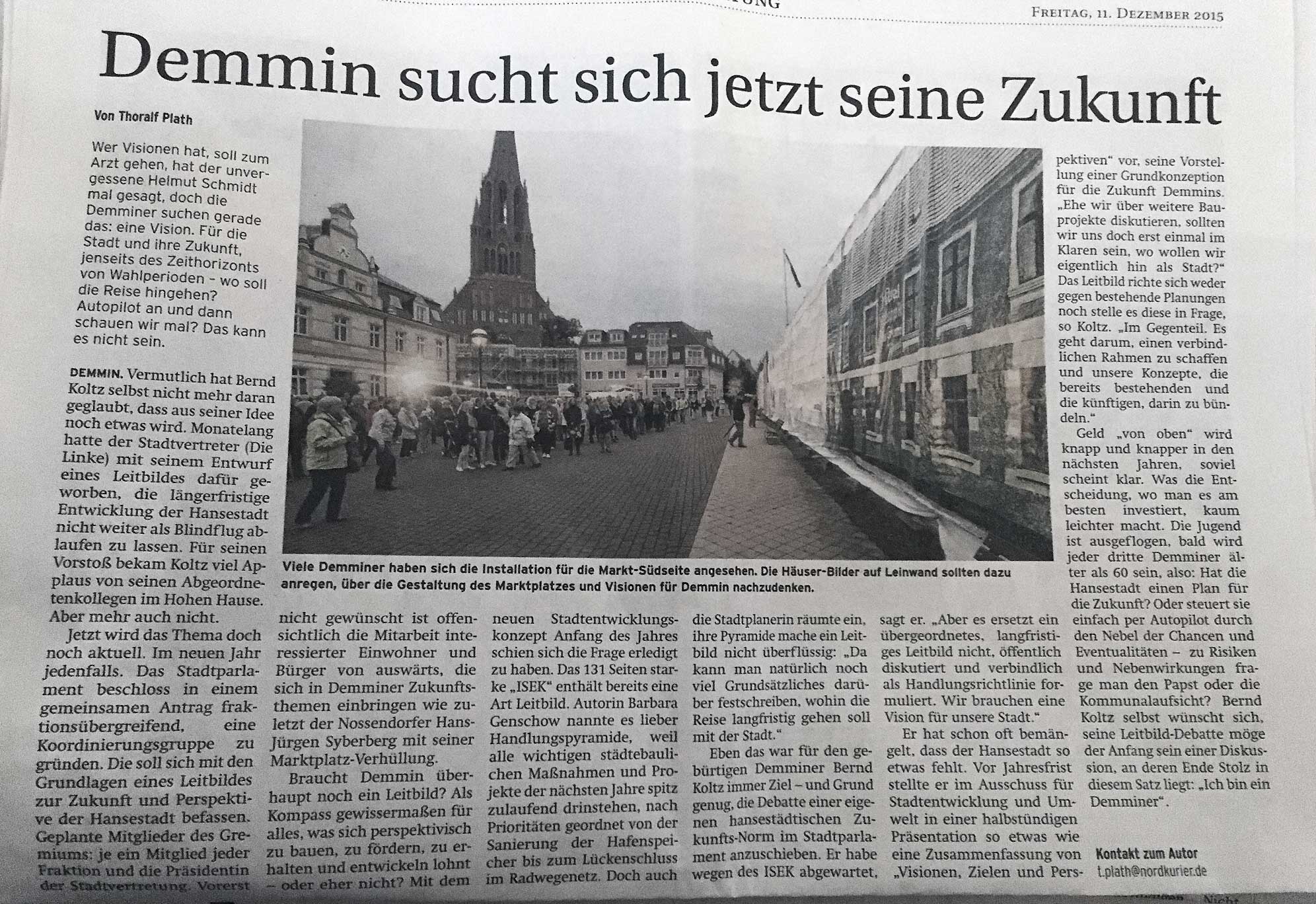 meinte der Geb. Gruss des Nordkurier. Als Bild. Die Antwort auf Wieviel Erde braucht der Mensch, die erste Vorführung eines Films hier. Den ersten. Als Wunsch aus Demmin selbst. Die Intastallation der historischen Marktsseite im Süden war der Dank dafür.