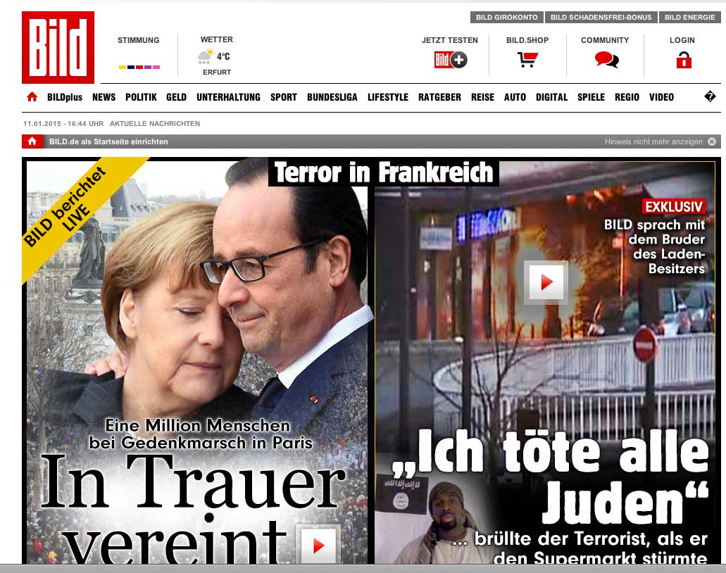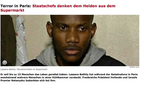 Für der Freiheit des Worts stehen sie auf, die Völker der Welt ohne Ansehen der Unterschiede, setzen Zeichen, zusammen alle in Nationaler Einheit, die Völker der Welt wie noch nie und der Präsident der Republik besucht die Kirche des Landes wie die Synagogen und Moschen, die Macht der Feder und Worte zu preisen für alle Welt. Trauernd und tröstend wo es not tut. Der "Held von Paris" ist ein Moslem. Er rettete die jüdischen Geisseln aus seinem Gebet aufgeschreckt im heimlichen Keller des jüd. Supermarkts.
