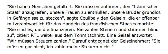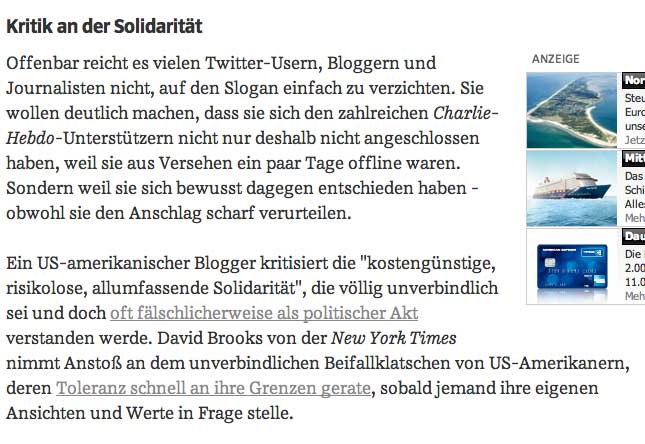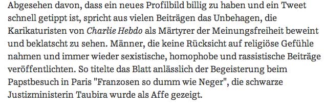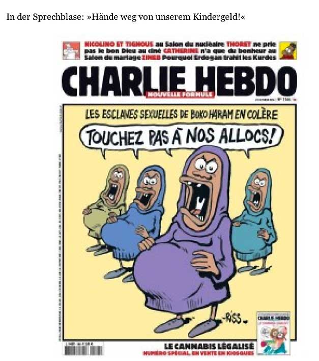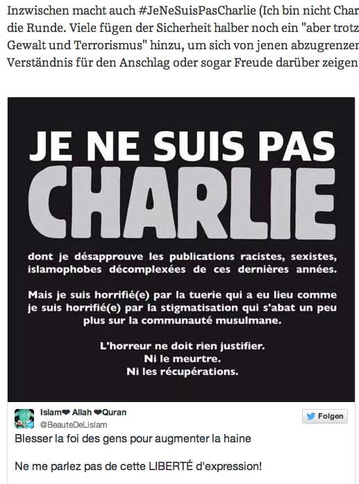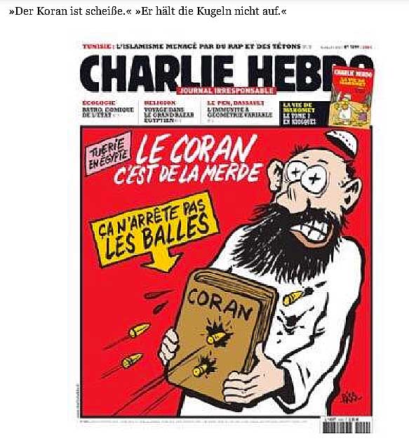 eine Türkin als Gast in der dt. Talkshow, dass die jüdischen Stimmen während ihrer Lesereise von "Stürmer" zu Zeit Hitlers gesprochen, wenn sie die Zeichnungen von Charlie Hebdo sehen. Und von der NY Times und Washington Post, die Verletzendes für andere Reigionen nicht drucken. Freitheit, die wir meinen.