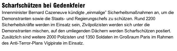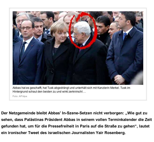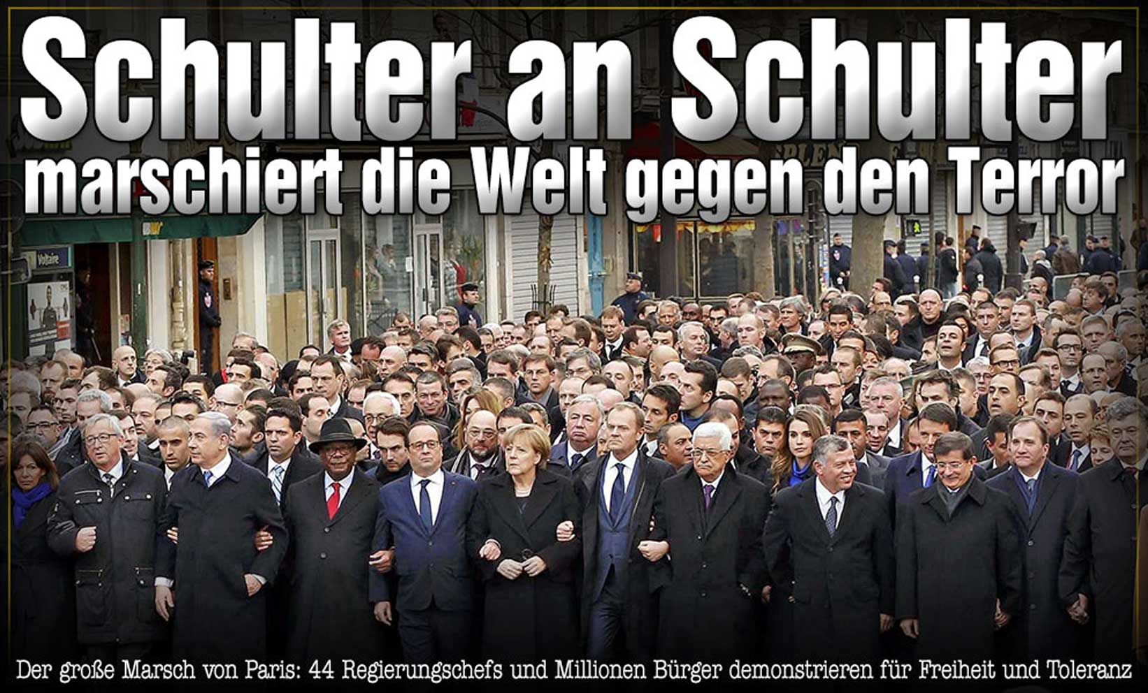 Schön, wenn so wäre. Freiheit der Meinungen-aber hatten sie denn eine Meinung. Aber schon die nächsten aanderen, im nationalen Spektrum der französischen Parteien waren ausgeschlossen und die Feinde der Freiheit des Worets in Ungarn und Russland waren auch da. Alles Wahlkampf mit den Mitteln des Flugzeugzeugs und der Medien. Netanjahu machte Wahkampf und verhalf Abbas/den Palästinensens also zu einem wichtigen Handschlag vor den Augen der Welt in Europa. Immerhin 20 Tote dafür- ein teurer Preis. Wenn für den Frieden wärs gut.