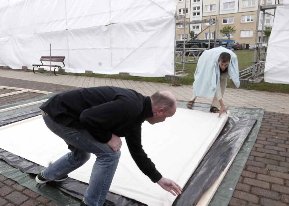 am Beginn des Aufbaus unserer Installation zur Marktseite 1-7 im südwesten des Platzes nahm mich Herr Quadt beiseite und zeigte mir die Aufnahme von 1945 der selben Häuser und damit die ganze Last, die wir zu stemmen haben, wenn wir hier nun wieder stehen und damit umgehen wollen. Auch wie dankbar wir sein müssen, dass sie uns gelassen wurde noch einmal frei damit umzugehen. Nicht verbaut zu sein mit dem, was nach 45 sonst in Demmin mit den Resten und als neue Stadt geschah.