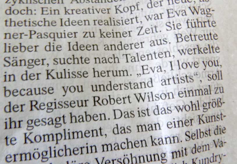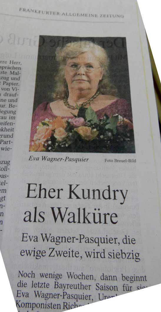 Zu ihren Verdiensten wird man rechnen dürfen, dass es heute den Fim über Winifred Wagner gibt, den sie vermittelte. Was wäre aber gewesen, wenn sie weiter dazu geständen wäre, und so Bayreuth. Vielleicht wäre sie dann auch heute eine geworden, die im Wahnfried wohnen könnte , RW behauptend, einzige Lösung im Geiste des Erfinders eines Bayreuth der Welt.