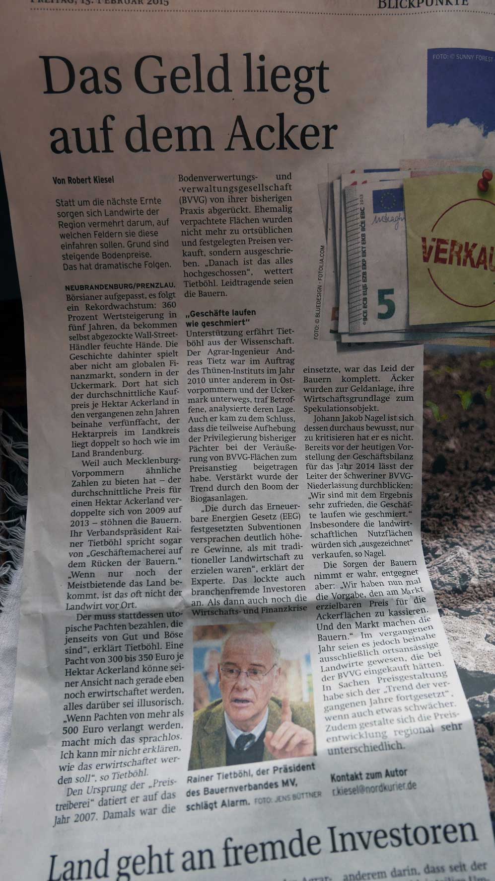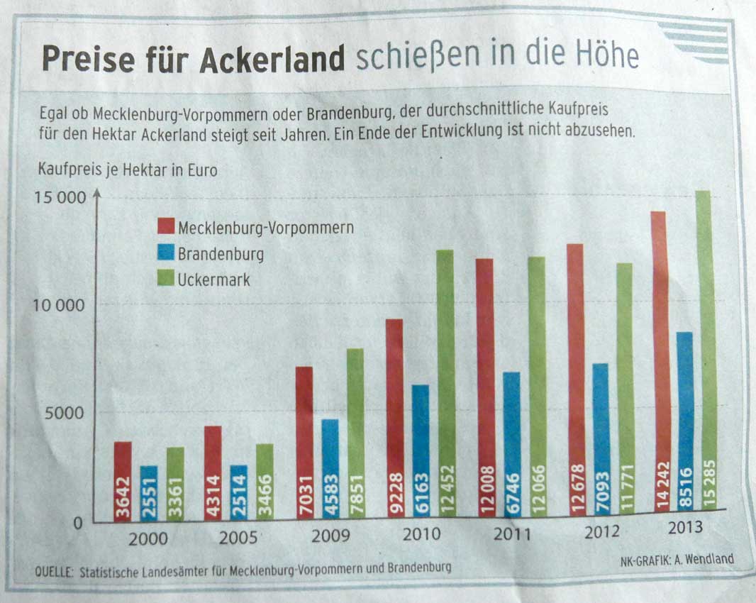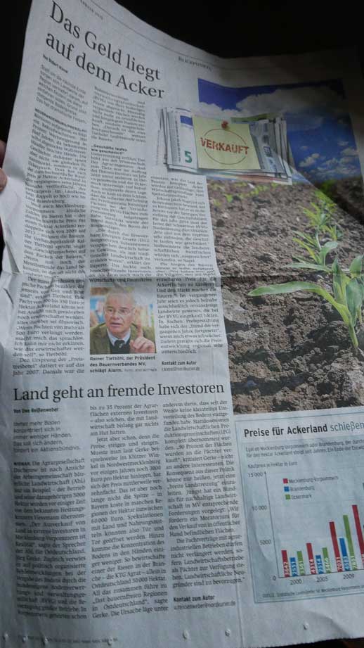 Seit dem Fall der Mauern sind die ehemaligen Verantwortliochen in den LPGs die Privilegierten der Umbruchs. Sie besitzen heute die Felder in Nossendorf durch besondere Vergünstigungen in der Übernahme und durch die Regelungen der Treuhand(BVVG) und durch besondere Kredite. Wenn sie nun bedrängt werden durch den ausgehungerten Markt mit überhöhten Preisen, die durch jene Bevorzugung gestiegen sind, müssen sie sich fragen lassen, was sie für die Geschichte des Landes der Bauten und Dörfer oder Gemeinden jener Kultur-Landschaften getan haben, Auch in der Kultivierung der Land-Wirtschaft, ihrer Wege und Gräben und Hecken. Damit sie vor den nun nachdrängenden und überfremdenden, betriebsfremden Investoren, die wie wie Heuschrecken über uns kommen, vorbildlich dastehen. Dass es das Ihre werde.