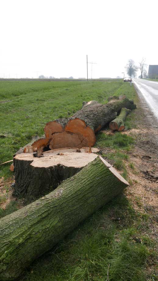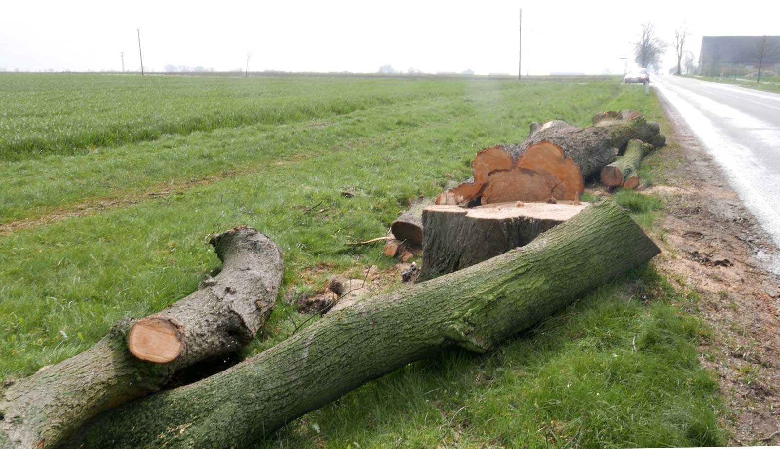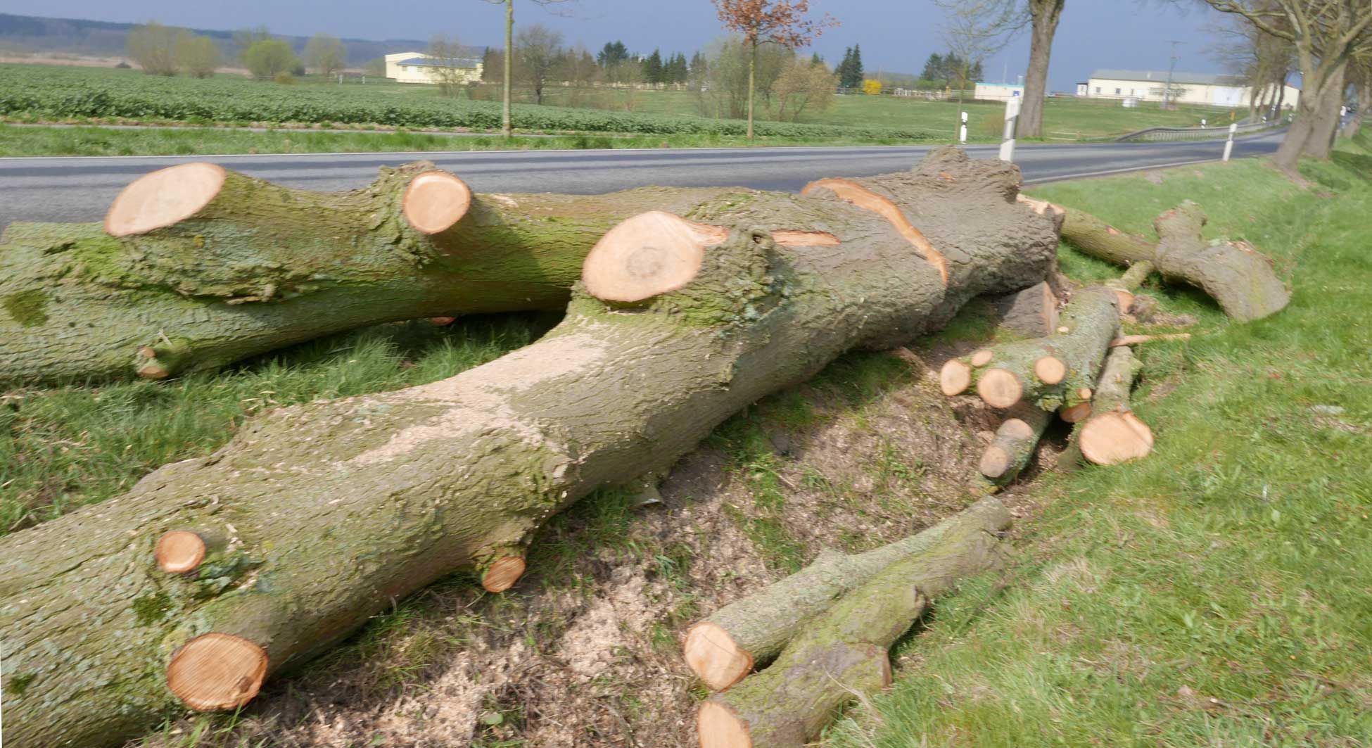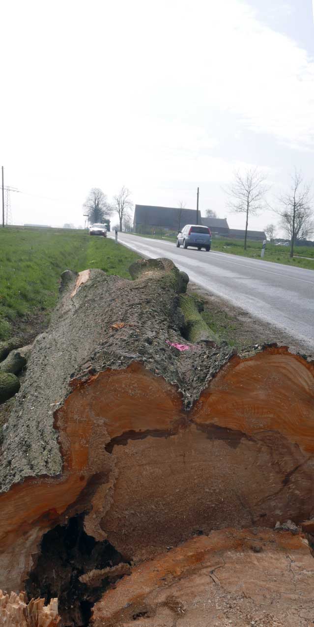 "eine stark geschwächte Vitalität. Der Totholzanteil in den Kronen ist so hoch, dass diese als absterbend oder bereits abgestorben klassifiziert werden können. Ferner setzt bei einigen Gehölzen starker Pilzbefall (Brandkrustenpilz, Lackporling, Austernseitling) in den Stammfußbereichen die Stand- und Bruchsicherheit der Bäume stark herab. Zur Schaffung der ordnungsgemäßen Verkehrssicherheit an der genannten Landesstraße ist es erforderlich, diese Bäume zu fällen".