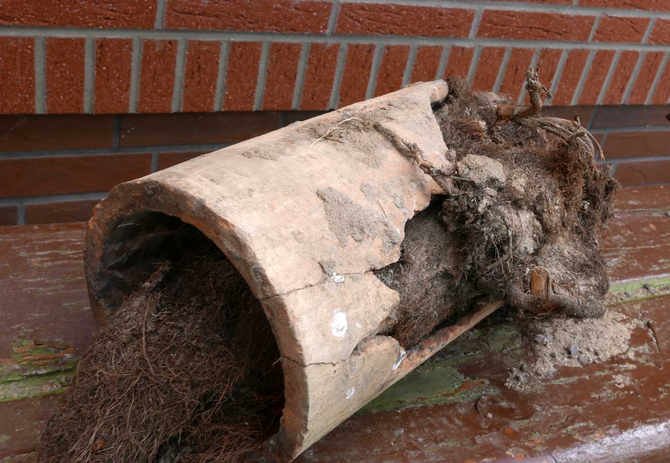 das Rohr im Graben und unter dem Baum durch war verstopft, zugewachsen mit Wurzeln