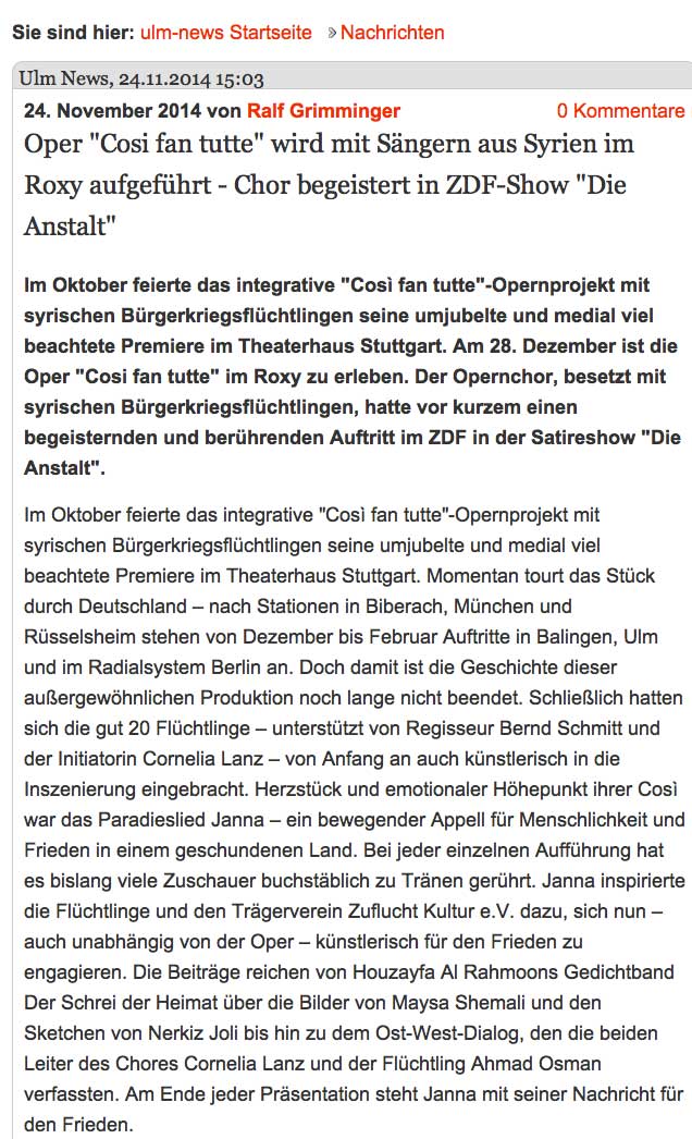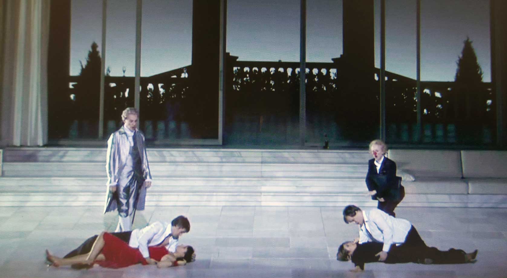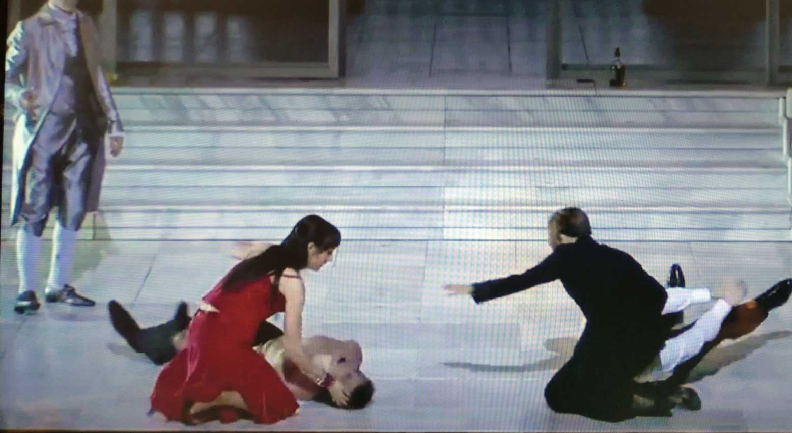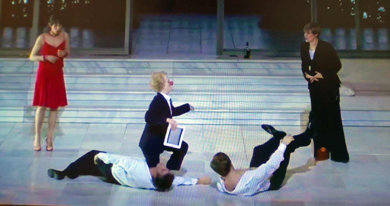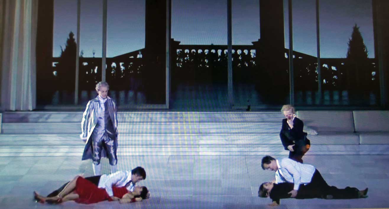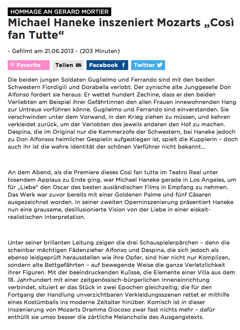 Was Mozart anbietet ist fundamental. Das Erkennen, wie alle unsere Gefühle auch woanders funktionieren, dass wir zuschauen können und müssen. Es selber sind. Aber immer durch einen Gott der Musik zusammengehalten - und das ent schuldigt alles. Hier. Vor uns. Die Töne aus dem Zustand des Verrats sind göttlich. Wie darf das sein. Mozart wollte das so. Es wäre falsch, zu deuten, in der Regie, dass die ursprünglichen Paarungen, die falschen waren.Wer sich entsetzt im Zuschauen des Verrats - ist selber Verräter. Es bleibt die Musik des Verrats. Als Güte des Himmels. Wir aber... sind ihre Werkzeuge der Töne und Bilder, wenn wir sie dazu schaffen.