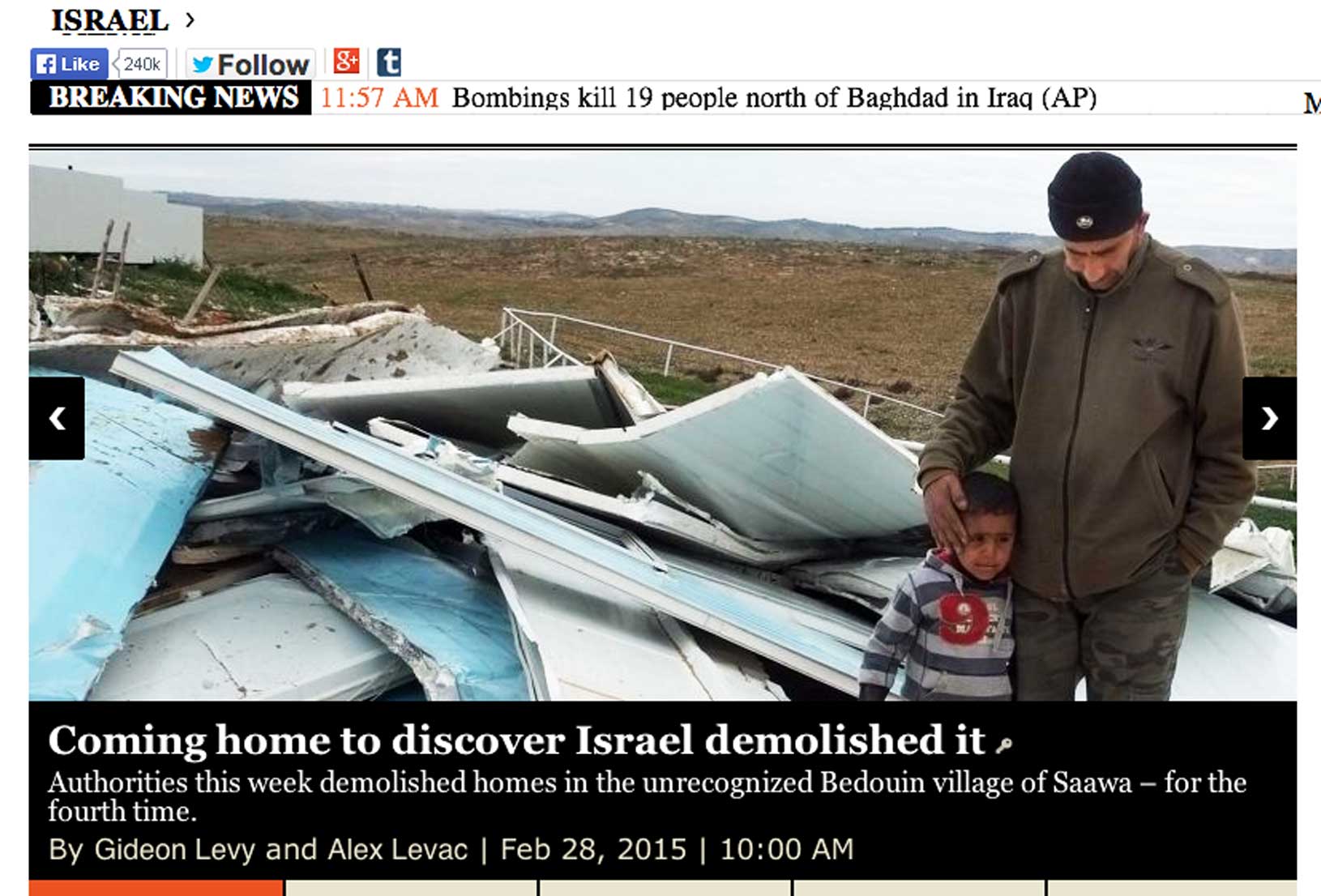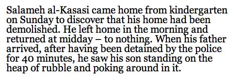 nachhaus gekommen aus dem "Kindergarten"(!)musste Salameh al Kasasi entdecken, dass sein Zuhauuse zerstört war. Er verliess ein Haus am Morgen und Mittags war es zerstört als er zurückkam, zu was.Als sein Vater zurückkam, verhaftet von der Polizei für 40 Minuten,sah er seinen Sohn stehen und weinen.