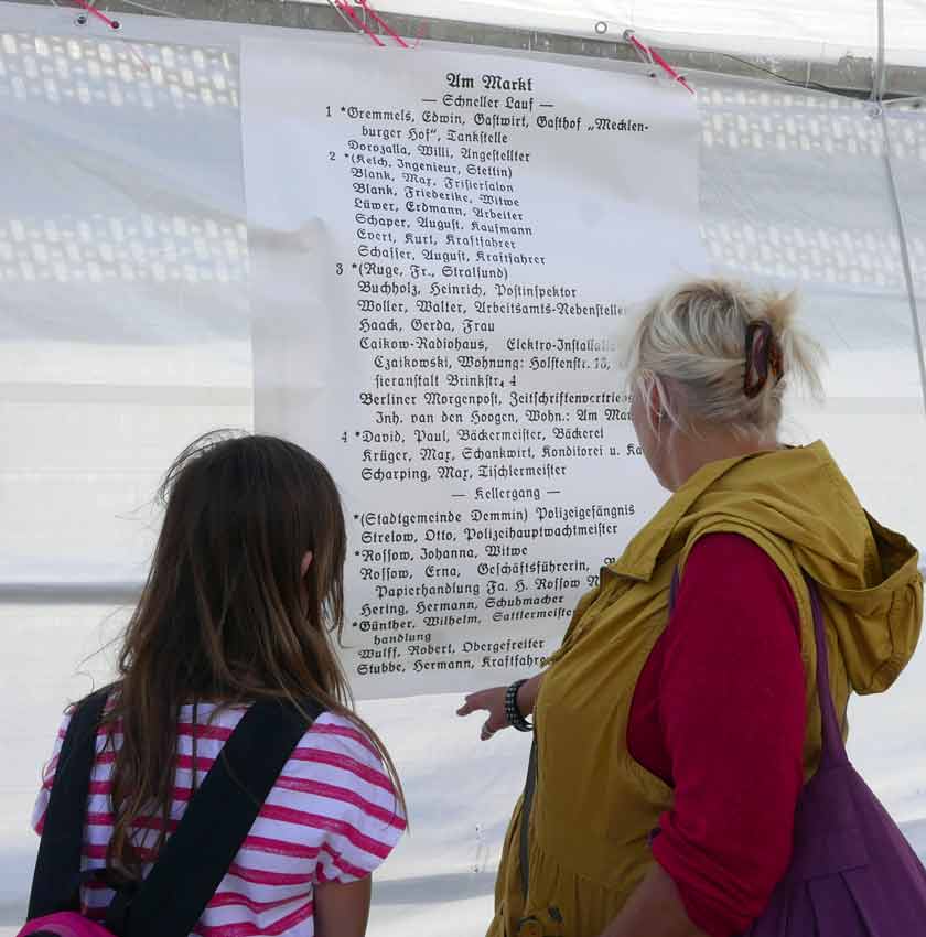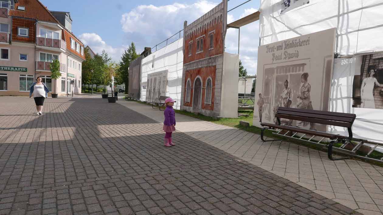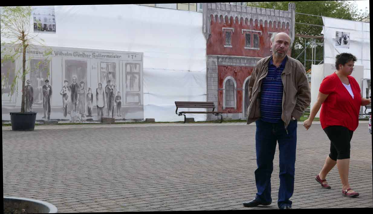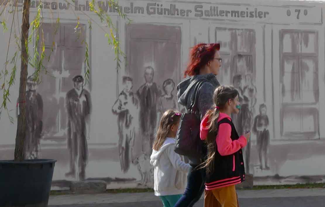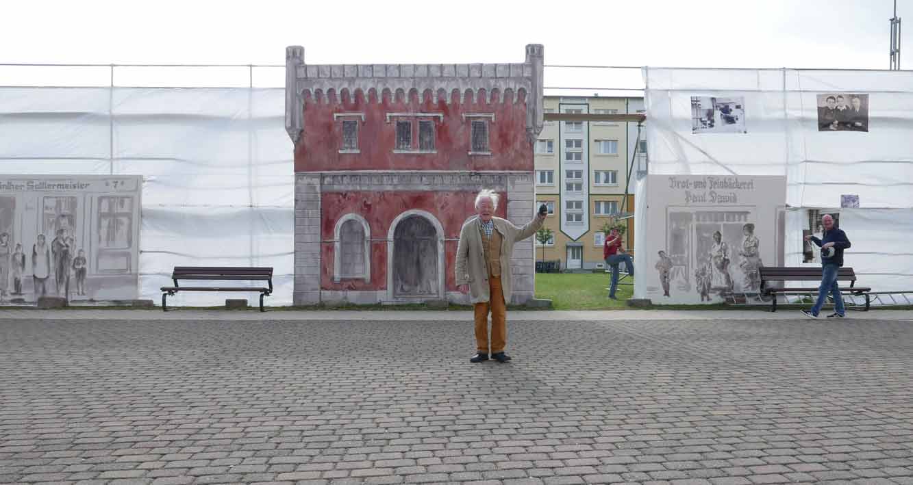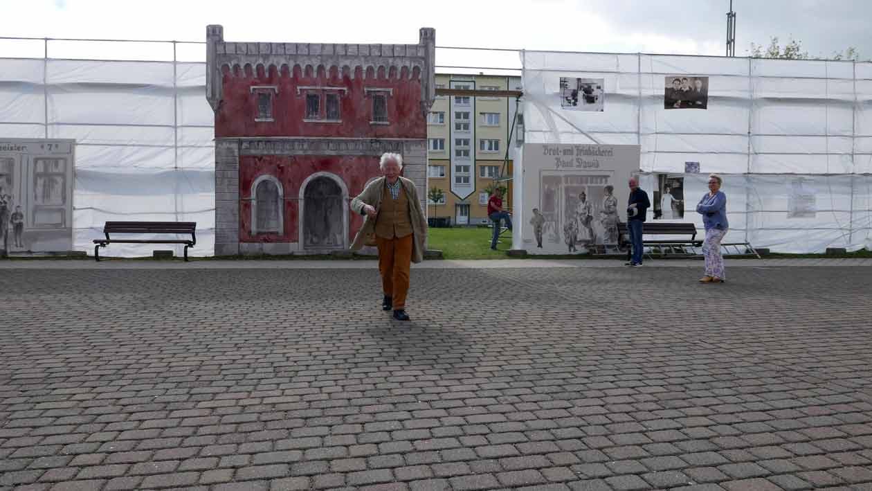 Zu sehen auf das Haus der Mutter Günther, die Zeit ihres Lebens schwieg, über das was ihr geschah 45. Vom Schicksal der Frau Feindt links um die Ecke des Kinos, wissen wir schon.