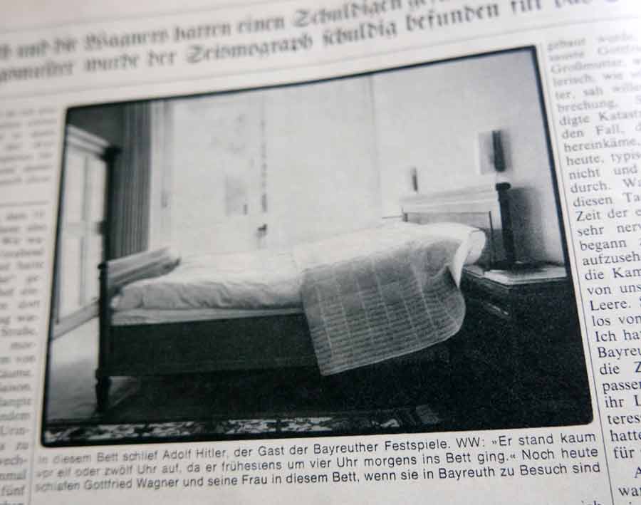 Nach dem Ende des historischen Wahnfrieds 1945 unter den Bomben, nahm immerhin der ältes Sohn Winifred Wagners noch Quartier in den Ruinen. Die nach dessen Tod der andere verkauft, an Stadt und Land. Der verbliebene Teil und Anbau von Siegfried Wagner , dem Sohn und von Winifred Wagner, der Witwe dann, wurde zur historisch brisanten Quelle der Geschichte, weil sich Hitler dort in den Sommern vor dem Kriege Richard Wagner widmete, den er als Ur-Erlebnis seiner Gedanken und Taten beschrieb.