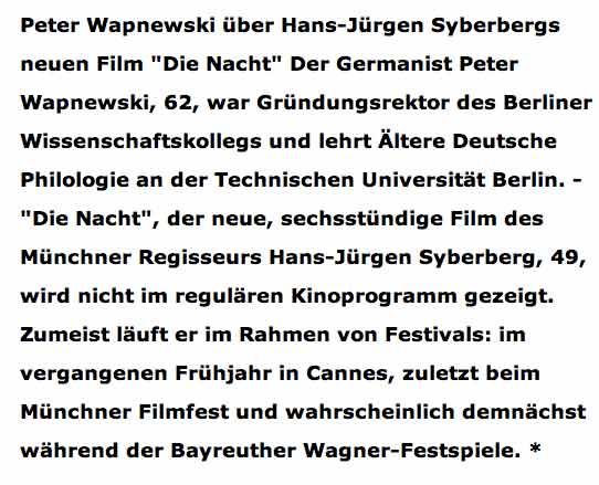 DIE NACHT in Paris und Kleist und zuletzt nach Nossendorf. Der Hilerfim aus Deutschland hatte in London Premiere und wurde in NY entdeckt. Der Parsifal auf Film aber wurde von Null Uhr bis zum Sonnenaufgang in Cannes ur-Aufgeführt.