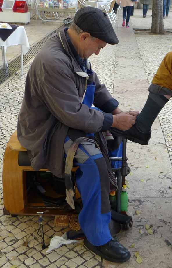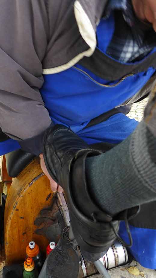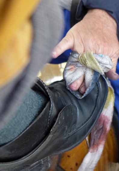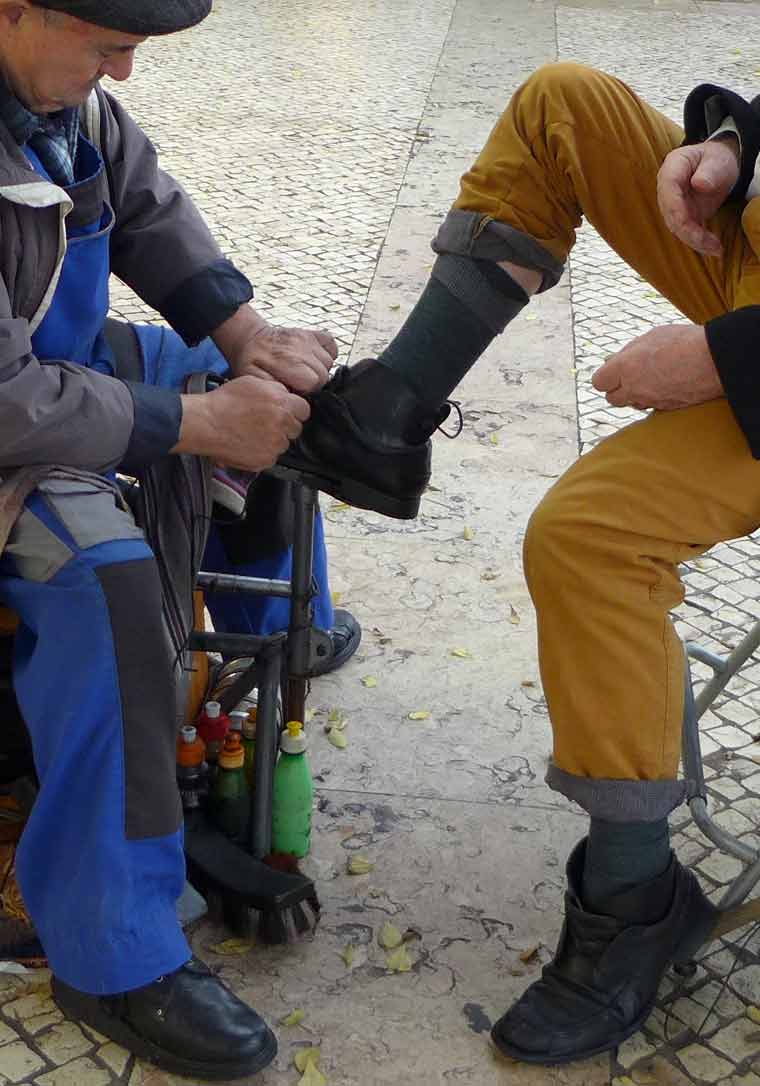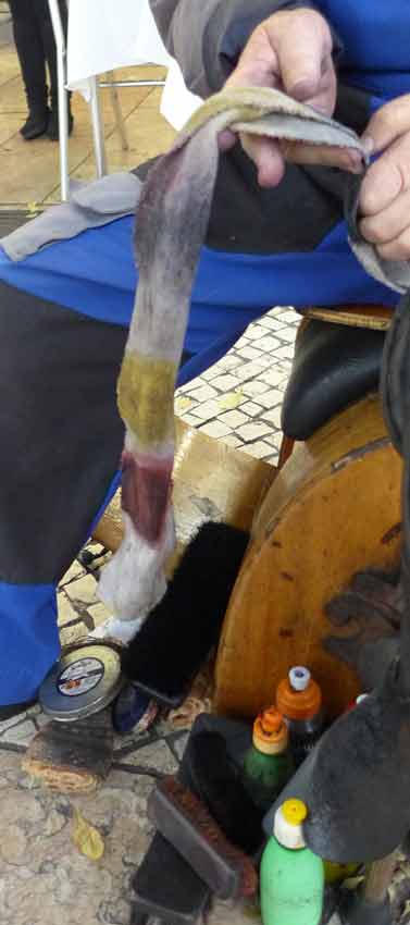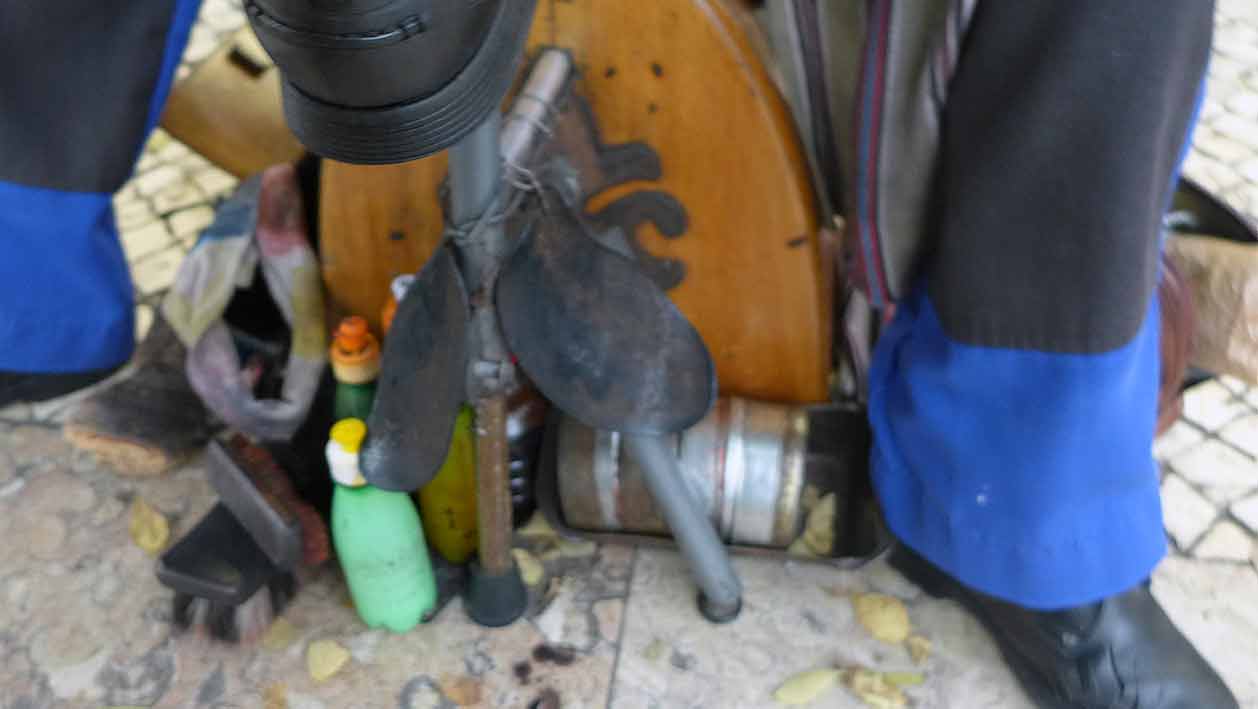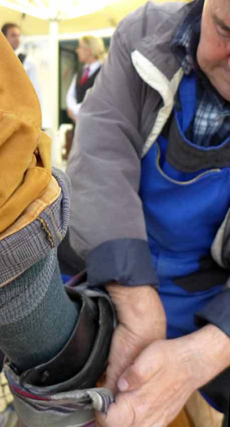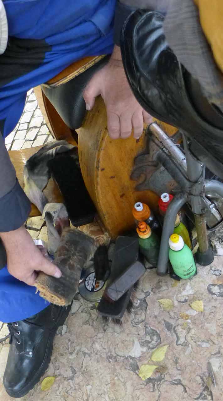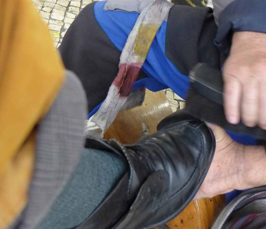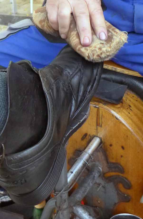 das Wichsen und Einschmieren und Polieren, mit Pasten und Crems aus Tuben und Dosen, Sorgfalt ist wichtig. Verschiedenen Bürtsen und Tücher. Die Strümpfe des Beins geschützt durch lederne Schilde