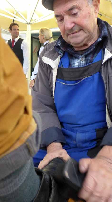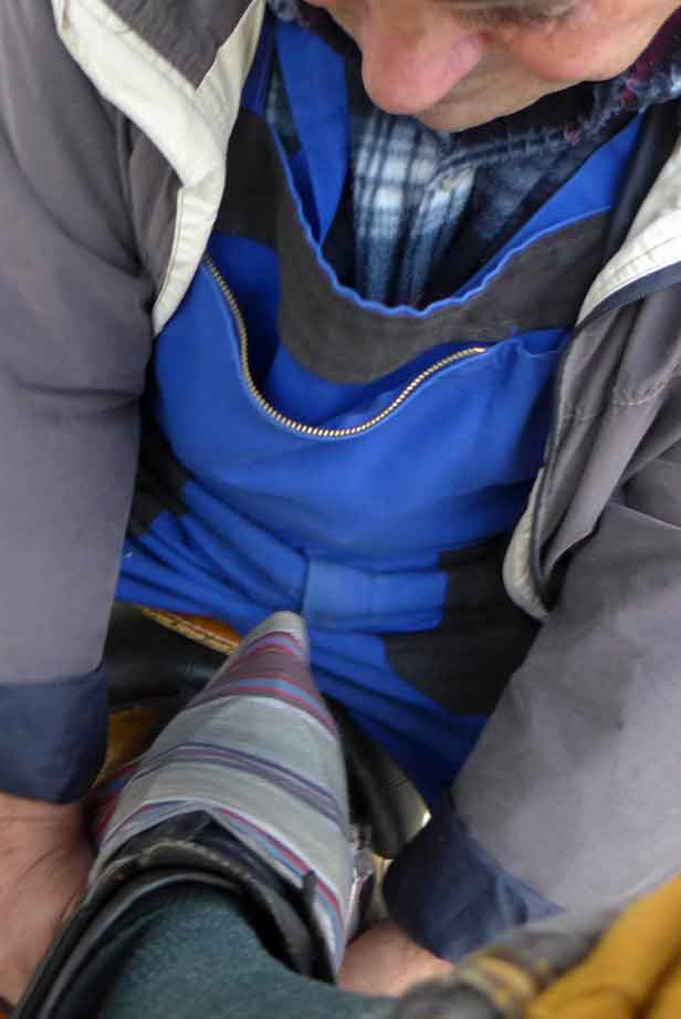 wortlos nur mit anstossenden Bewegungen zeigt er was nun kommt. Der andere Schuh, das andere Bein hoch, zuerst die Schnürsenkel rausgenommen, damit er rein kommt, alles frei wird, locker