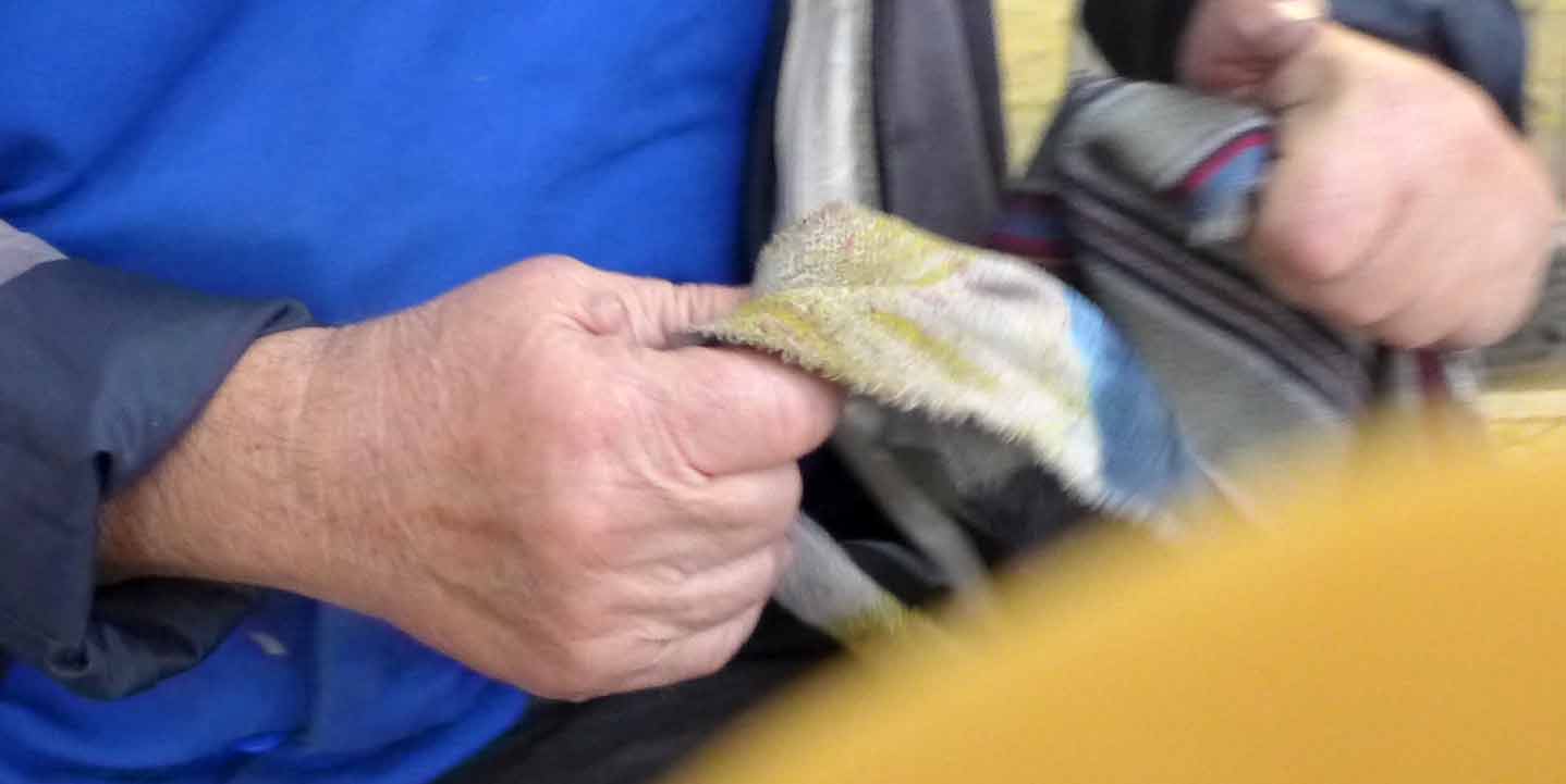 das Reiben und mit verschiedenen Tüchern und Bürsten und Tinkturen
