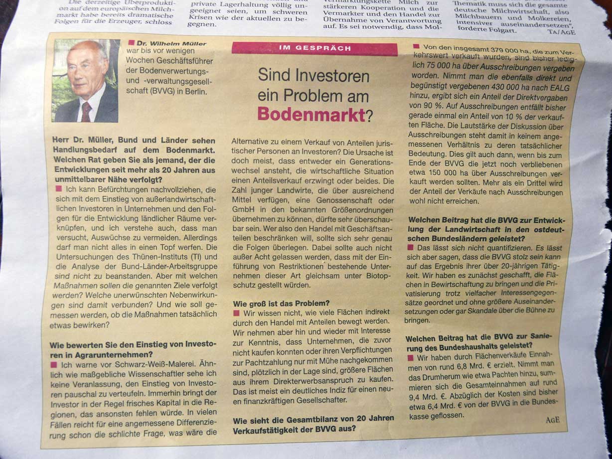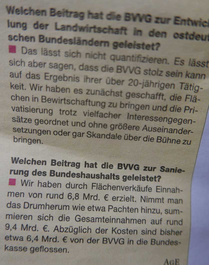 Dr. Wilhelm Müller, der Geschäftsführer der BVVG(Treuhand nach dem Fall der Mauer) zieht Billanz aus der Verteilung der landwirtschaftlichen Flächen.