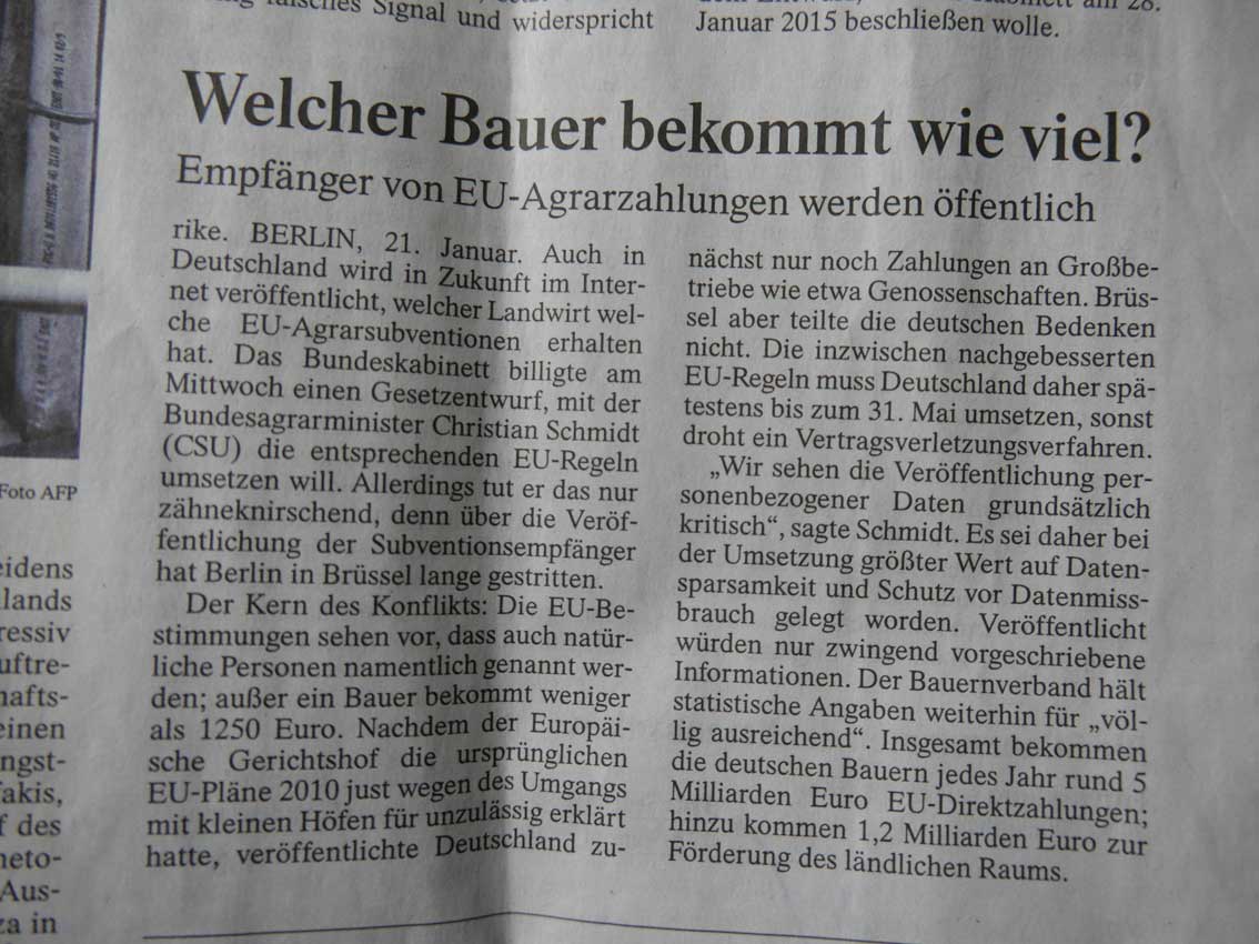 Nach neuem Gesetz der EU müssen bis 31. Mai die Zuwendung aus Brüssel an die Landwirtschaft öffentlich aufgelistet werden. Sonst Strafen bis Entzug.