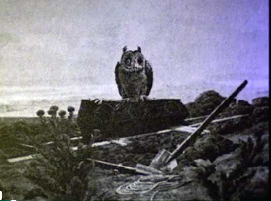 Alexander Kluge, der Alte nun, gerade zum Theaterbeirat in Berlin ernannt, machte vor einiger Zeit eine Sendung zum Titel Wieviel Erde braucht der Mensch und setzte dieses Bild dazu hinein. Was heissen sollte -entsprechend der Geschichte von Tolstoi, die uns vor vielen Jahren beschäftigte, solange wie wir diesen Weg hier gingen- soviel wie des Grab breit und tief ist. Dazu die Geschichte des Mannes der sich im Streben nach immer mehr Land zu Tode läuft. Und darüber im Bild die kluge Eule auf dem Sarg. Heute würde ich sagen soviel Land brauchen wir, wie nötig ist, den Bäumen Überleben zu gewähren. Als der Vater von seinem Land gehen musste, waren sie in höchster Gefahr. Sie wieder zu pflanzen war das erste Ziel als wir wieder kamen.
