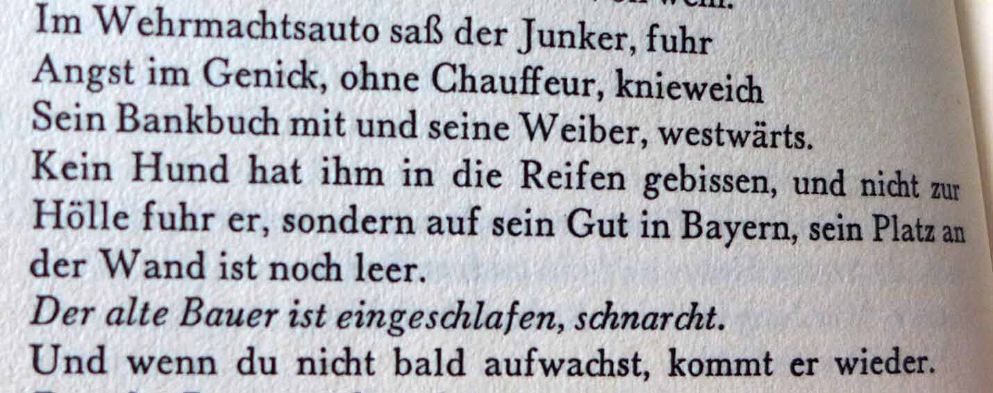 So bei Heiner Müller in seinem Bühnenstück Die Umsiederlin/Die Bauern. Manche haben sich hier verkrochen. Wir werden bald darüber berichten. Was daraus geworden ist. In welcher Gestalt. Die sie am meisten scheuen.