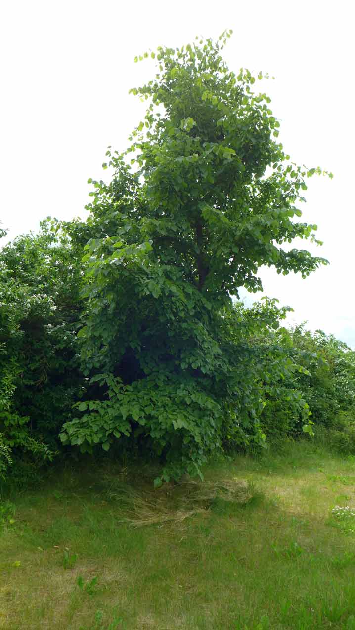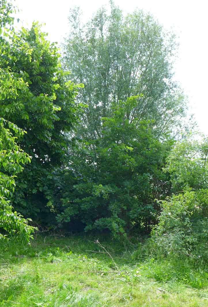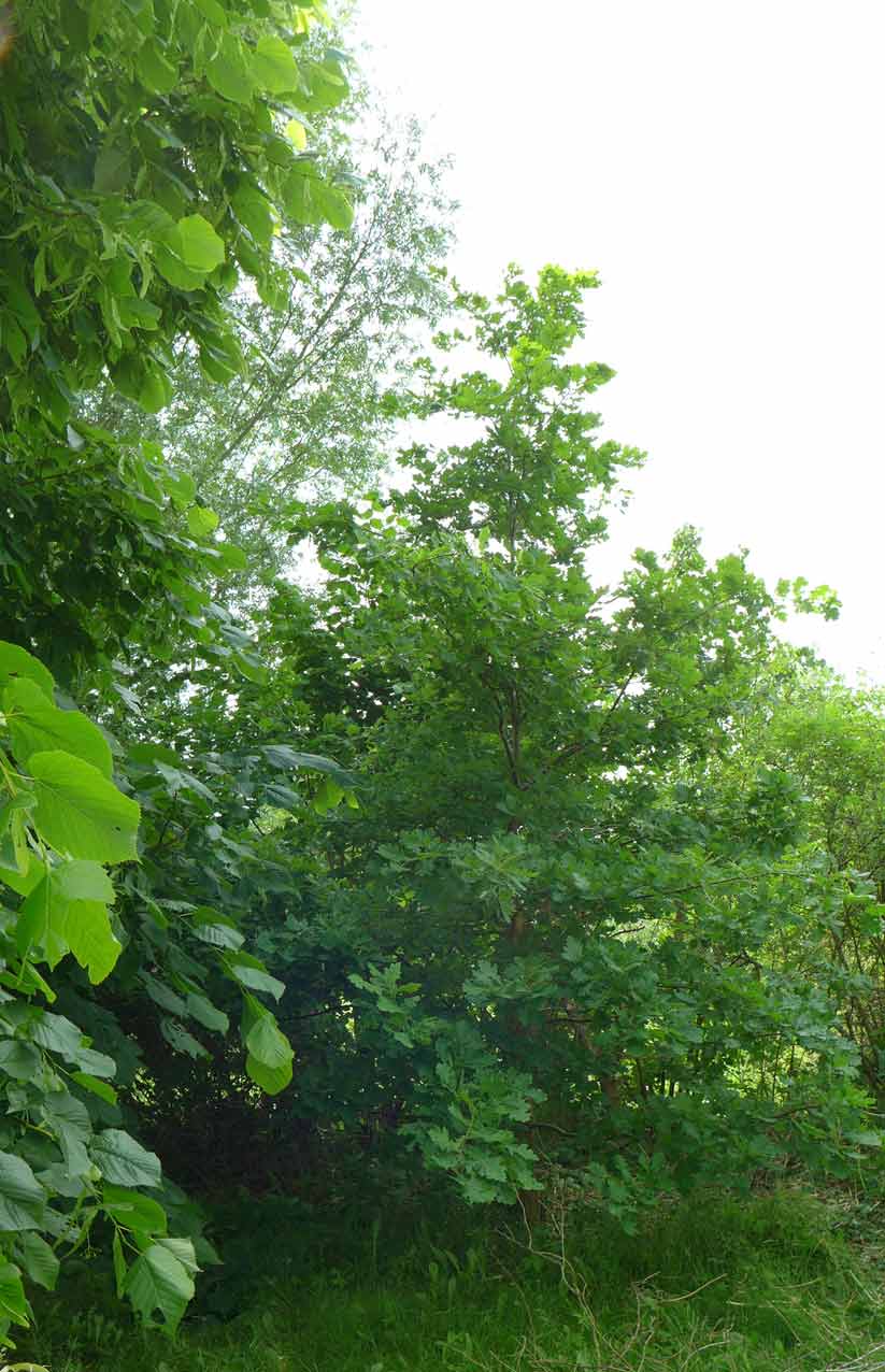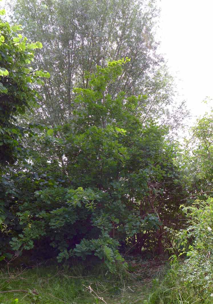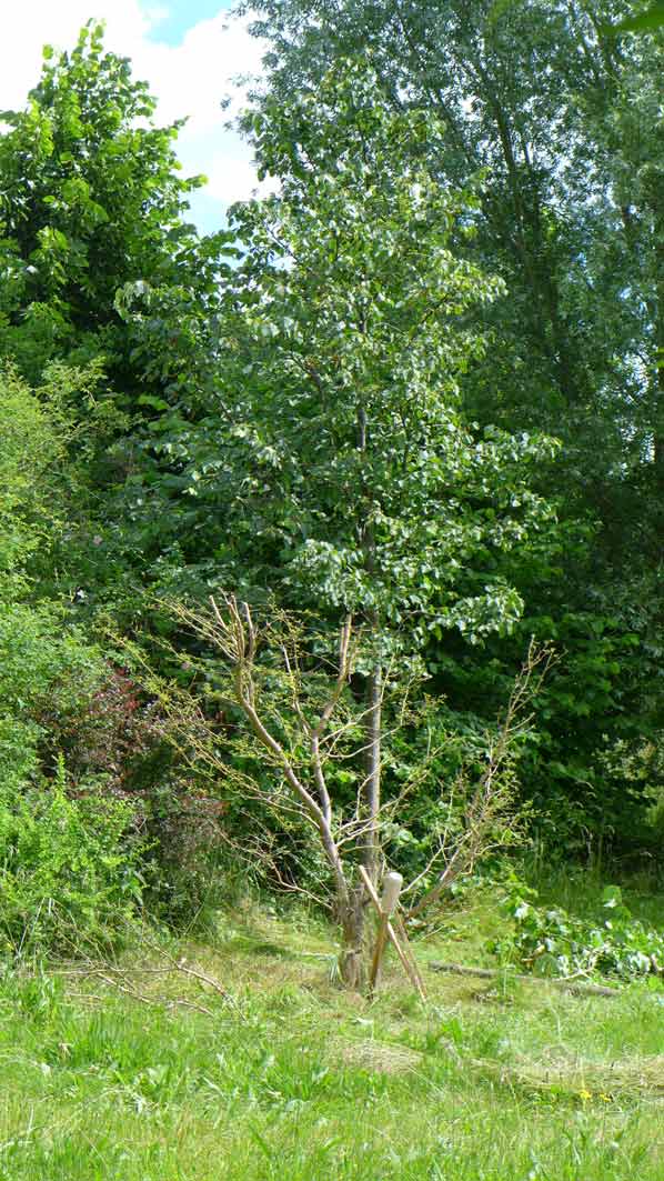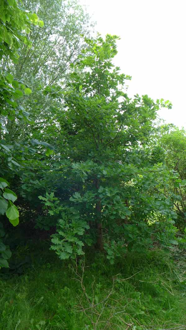 die Eiche wieder ausgetrieben nach Schnitt auf Brusthöhe wegen Pilzbefall und nun frei von den überwuchernden Nachbarn, Vor der Weide, inzwischen als Ersatz gesetzt.