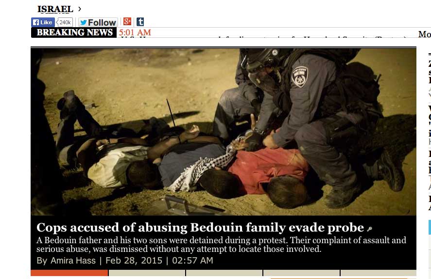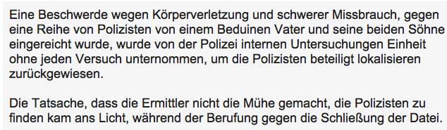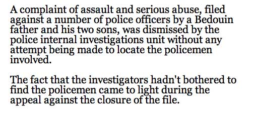 Eine Beschwerde wegen Körperverletzung und schwerer Missbrauch, gegen eine Reihe von Polizisten von einem Beduinen Vater und seine beiden Söhne eingereicht, wurde von der Polizei internen Untersuchungen Einheit ohne jeden Versuch unternommen, um die Polizisten beteiligt lokalisieren undzurückgewiesen.