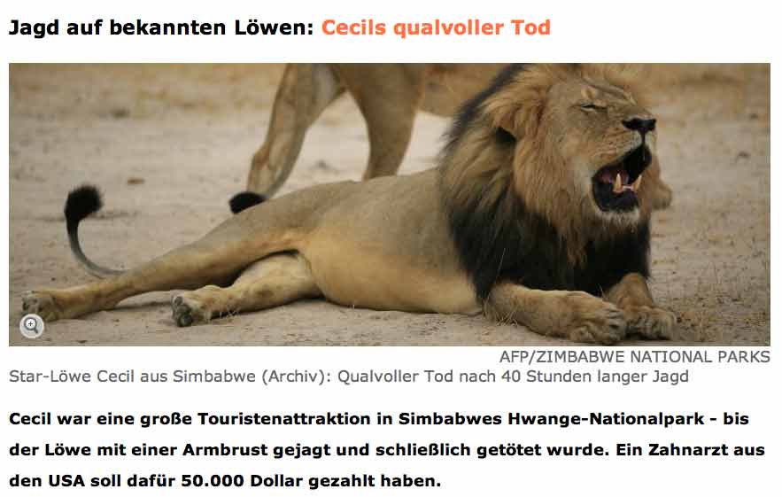 Laut ZCTF hatten US-JŠger P. und Safari-Organisator B. den Lšwen mithilfe eines an ihrem Wagen befestigten toten Tiers nachts aus dem Nationalpark gelockt - und zunŠchst vergeblich versucht, ihn mit einer Armbrust zu erlegen. Cecil wurde demnach verletzt, konnte zunŠchst offenbar fliehen. Doch seine Verfolger hetzten das Tier rund 40 Stunden lang, spŸrten es schlie§lich wieder auf und erschossen es.