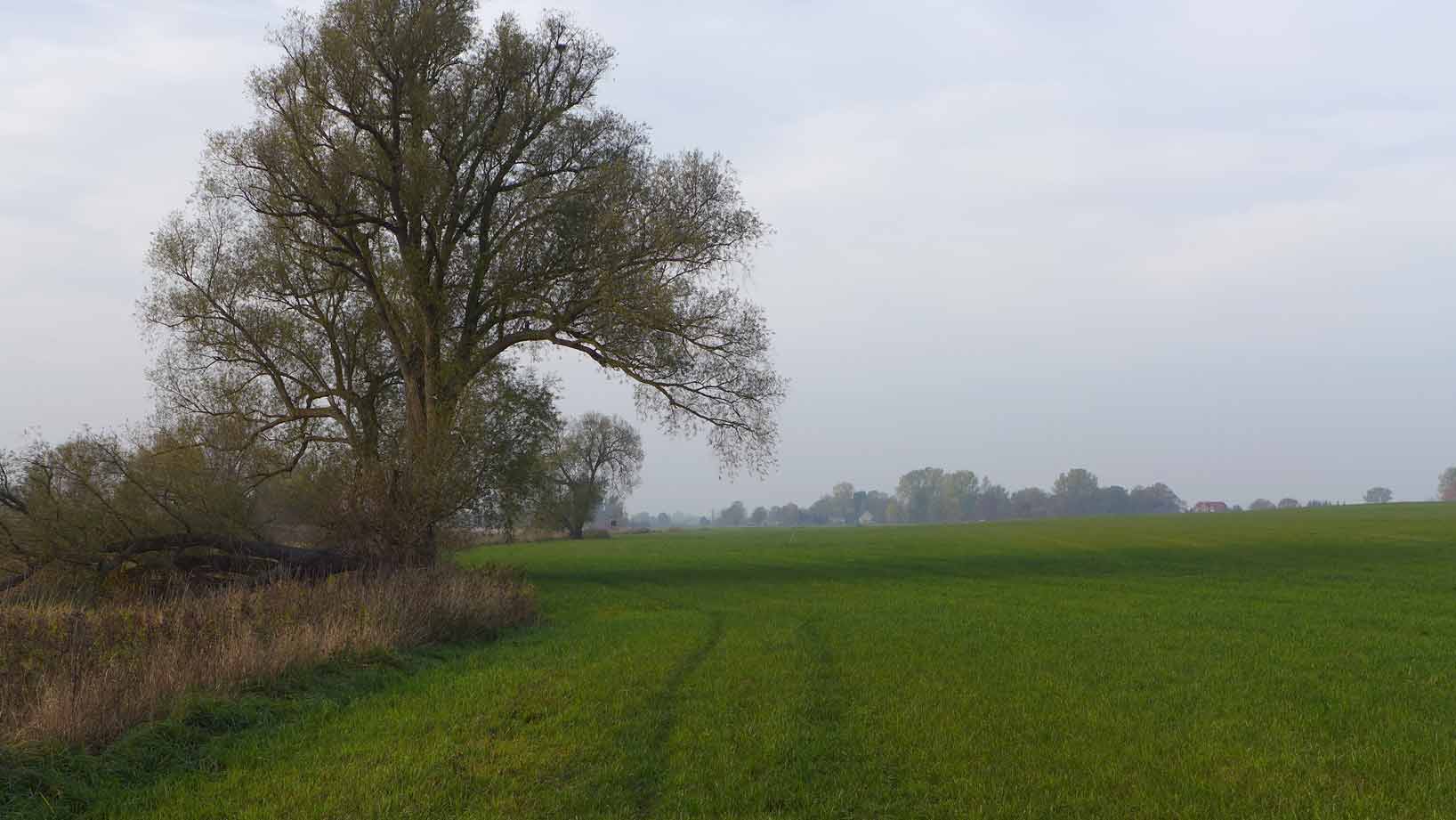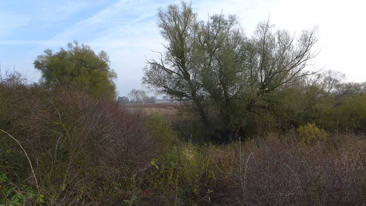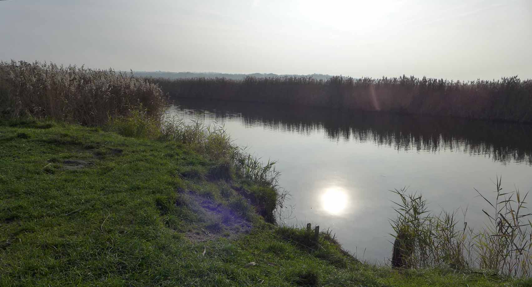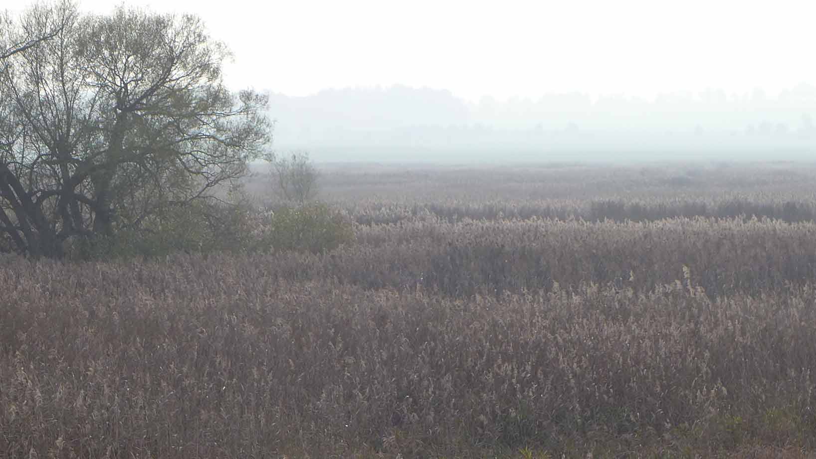 Der Fluss iost nun wieder in seine Wildnis eingebetet, früher zu unserer Zeit sanft den Wiesen und Kühen und den badenden Kindern übergeben. Das Hinterland hinab in Feldern und Inseln der Baume gehörte dazu. Die Windräder der Dränagen zur Entwässerung, sorgsam in Gräben gefasst, sind verloren. Aber der Fruss, der fliesst, wie immer noch.