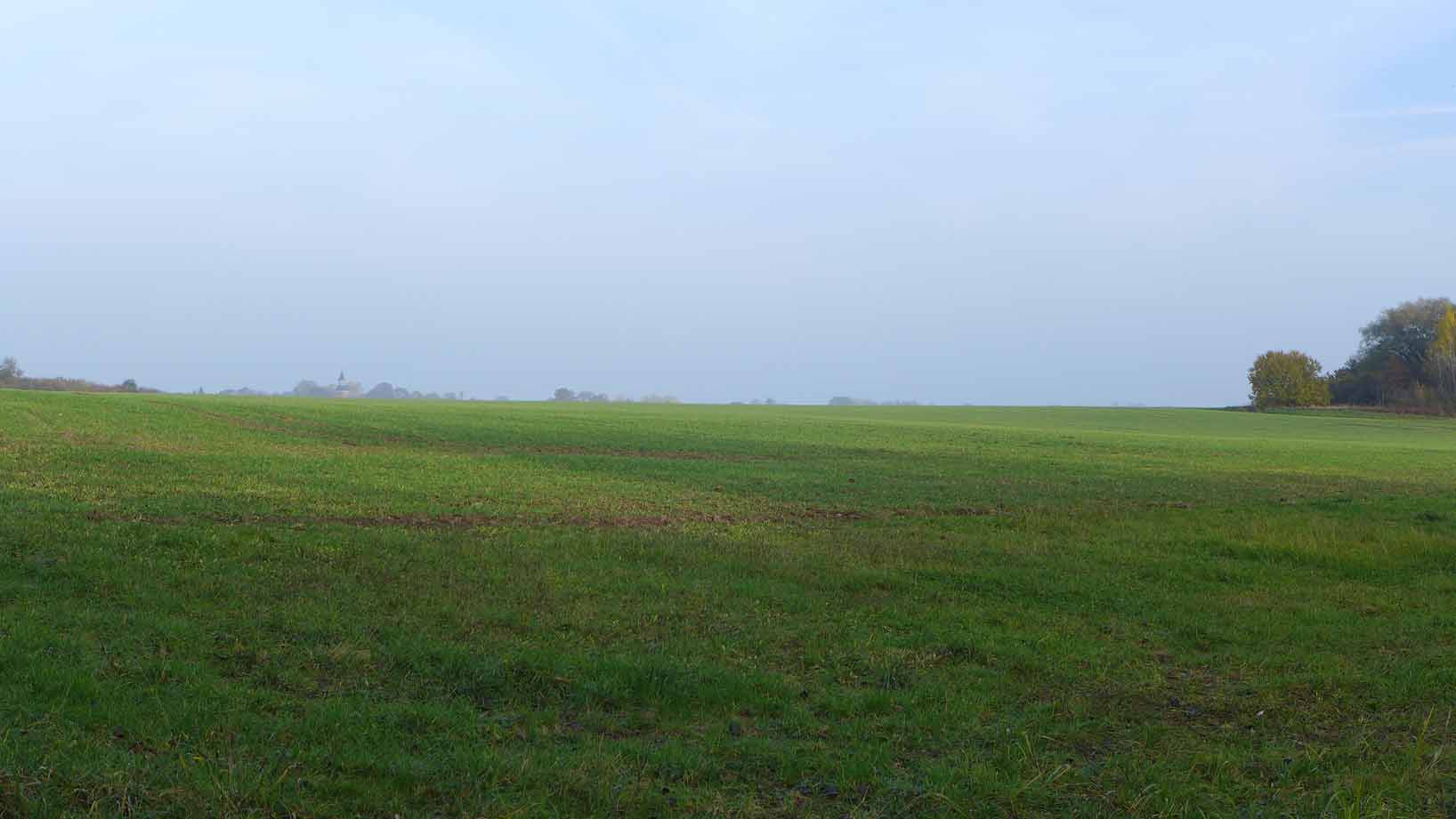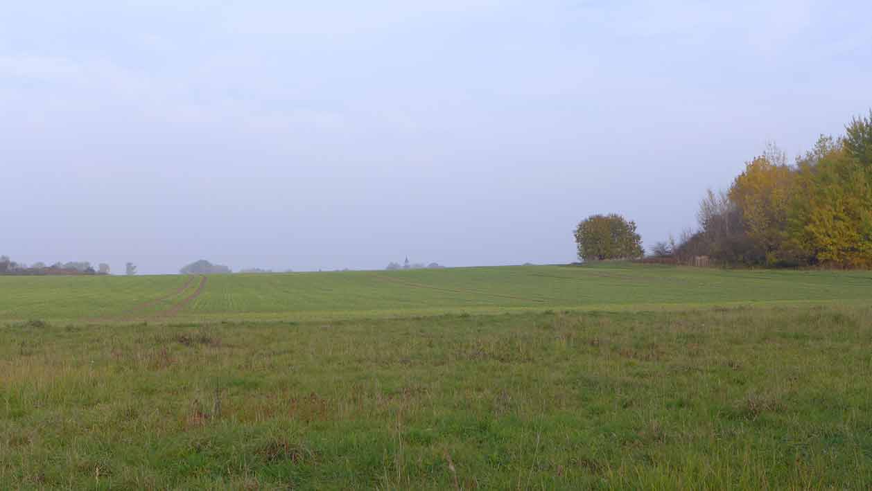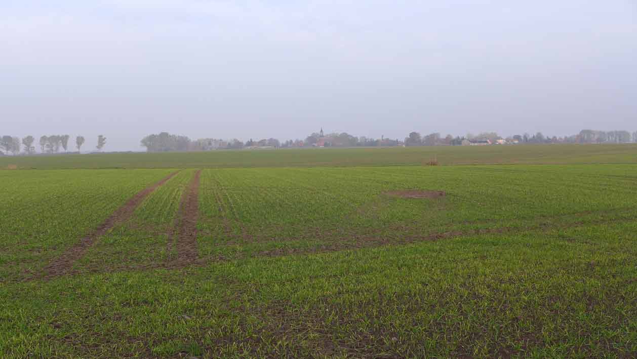 an der Trebel aufwärts an der sich die Kette der Dörfer reiht. Den Turm aus Nossendorf immer im Blick.