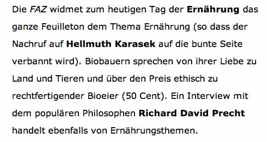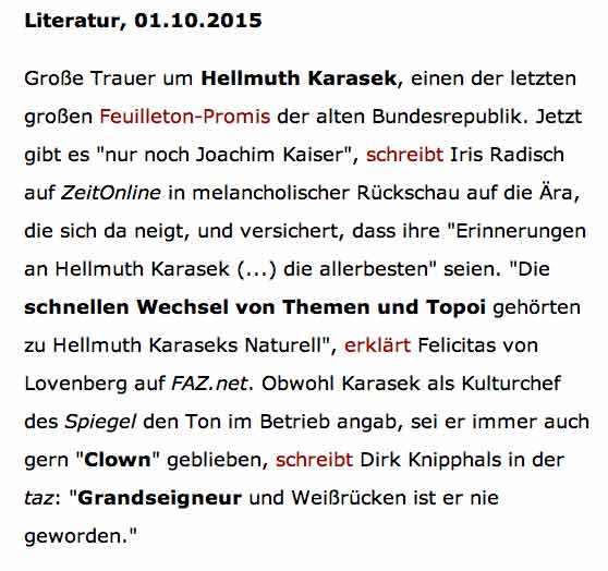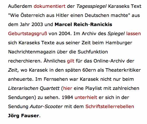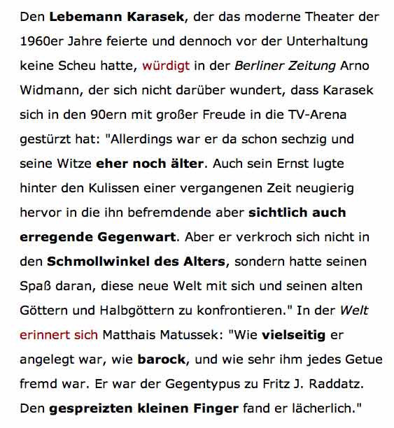 Am selben Tag, erschienen in zwei Publikationen 1990 im Jahr der Wiedervereinigung in drei Beiträgen gegen den Verfasser des Buches Nach dem Unglück und Glück der Kunst nach dem letzten Kriege und gegen den Hersteller des Films Hitler, Ein Film aus Deutschland. Dieser nun viel Gerühmte war einer der Verfasser davon. Danach gabe es keinen Film mehr, kein Theater und kein Buch mehr von dem solcherart Verfolgten. Alle 3 nannten Reich Ranicki als ihren Lehrmeister. Dieser und 2 der anderen Helden der Zeit des Westens sind nun tot. Eben dieser nun vielgerühmte Held der neuen Freiheit verwendete Himmler-Zitate aus dem Hitlerfilm als Meinungen des Autors zum Beweis gegen ihn. Eine Entgegnung wurde auch nicht als Leserbrief erlaubt. Der heute noch im Grabe so Gefeierte selbst ein Eliteschüler dieses H. gegen den, der nie dessen Uniform getragen als Junge, nun als solcher der ewig HJ beschimpft, in der angelernten Blindheit seines Faches oder im Selbst-Hass seiner Herkunft insgeheim macht Karriere. - Heute ist es unsere Ehre widerstanden zu haben - auch in unserer Zeit. Denn auch diese Zeit braucht Widerstand. Gegen das Meinungsestablishment West-Deutschlands im Konsensgetümmel aller Berufs-Protestler. Das erwähnte Buch aber war ein Beitrag zu neuer Einheit, der vom Westen zu leisten war. Aus dem Produktions-und Äusserungs-Bann im Bereich des intellektuellen Betriebs sich zu befreien wurde der daraus sich ergebende Versuch von Nossendorf. Tief abseits und von Grund auf. Unerbittlich und mit neu geschärften Sinnem. Getreu ganz anderem Sinnen und Sinn.