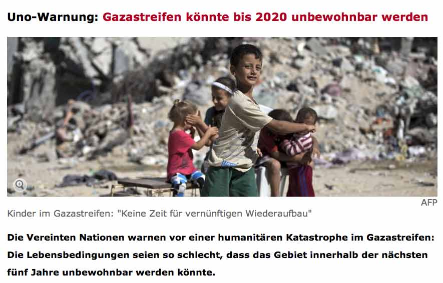 Genf (dpa). UN-Experten haben ein düsteres Zukunftsszenario für den Gazastreifen gezeichnet. Sollte sich an den gegenwärtigen ökonomischen Entwicklungen nichts ändern, könnte das Küstengebiet bis 2020 unbewohnbar werden. Das teilte die Konferenz der Vereinten Nationen für Handel und Entwicklung mit. Neben einer achtjährigen Wirtschaftsblockade habe es in den vergangenen sechs Jahren drei Militäreinsätze im dicht besiedelten Gazastreifen gegeben. Diese hätten der ohnehin maroden Infrastruktur weiteren Schaden zugefügt sowie Wiederaufbau und wirtschaftliche Erholung behindert.